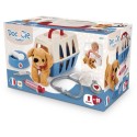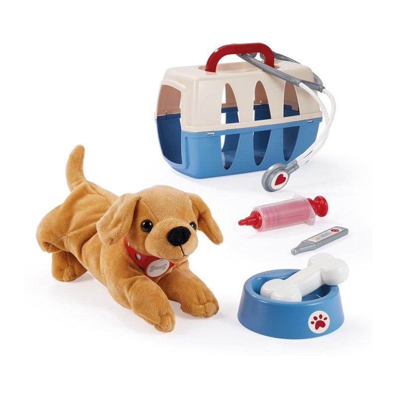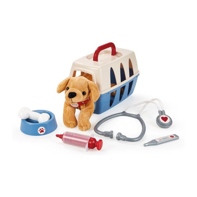 Un joli petit chien en peluche dans sa valisette de transport avec une écuelle, un os, un stéthoscope, un thermometre et une seringue. Des 18 mois. Fabrication Française.