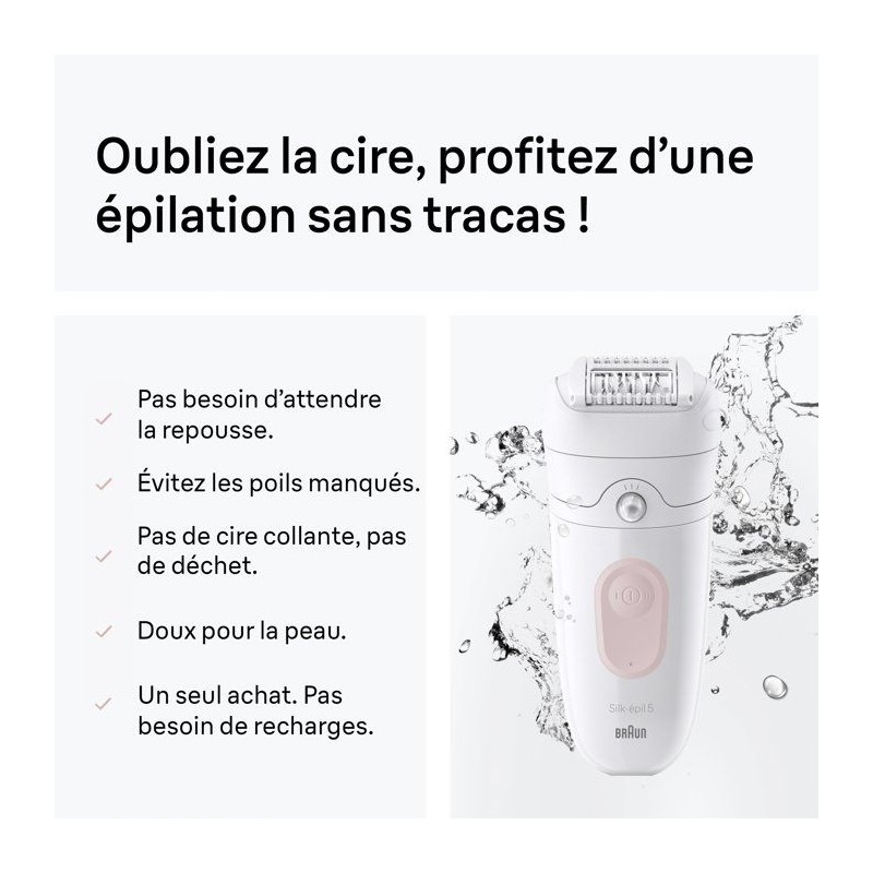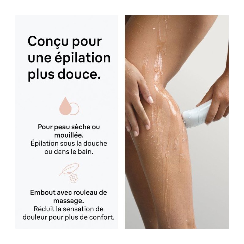L'épilateur Braun Silk·épil 5 offre jusqu'a 1 mois de peau douce, quand vous voulez. Cet épilateur Braun sans fil est doté de micro pincettes permettant d'attraper des poils que la cire ne peut pas retirer (des 0,5 mm). Réduisez la sensation de douleur grâce a l'embout avec rouleau de massage. Plus besoin d'attendre la repousse des poils contrairement a d'autres méthodes d'épilation comme la cire. Cet épilateur est conçu pour une utilisation pratique a la maison sans prise de rendez-vous. Conseil : pour réduire la sensation de douleur, épilez-vous dans le bain ou sous la douche avec de l'eau tiede.