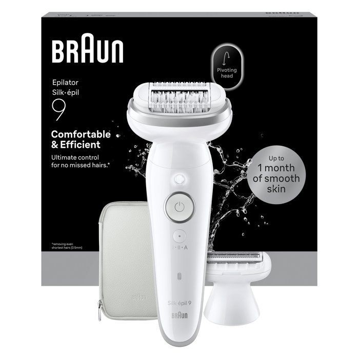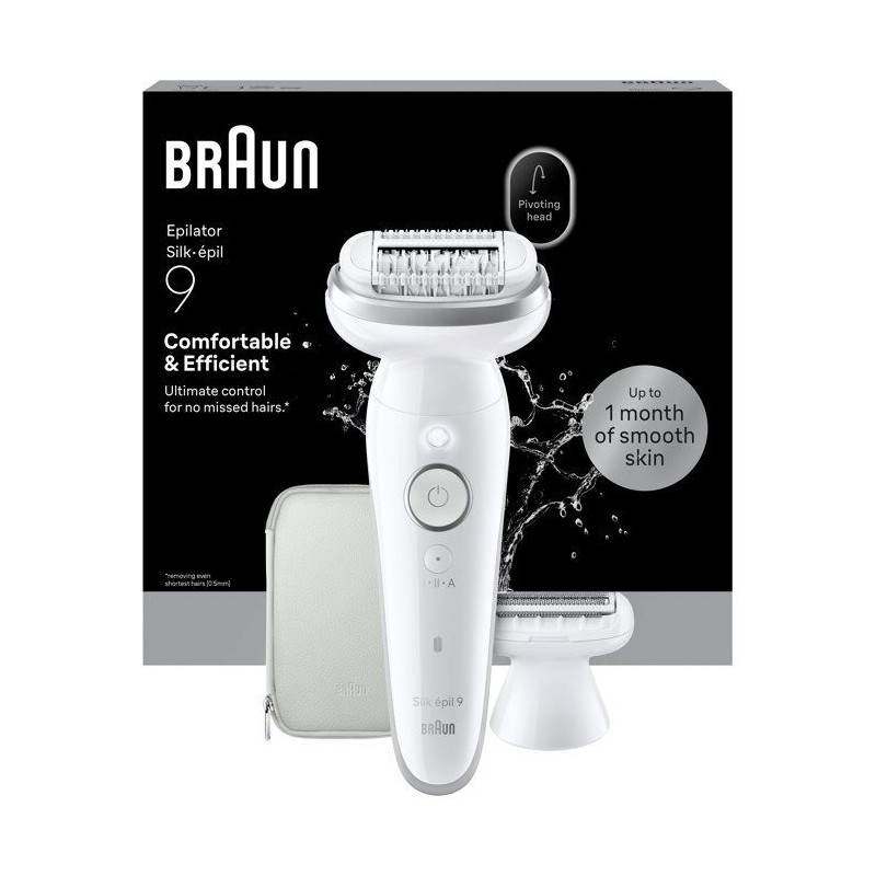 L'épilateur Braun Silk·épil 9 offre jusqu'a 1 mois de peau douce, quand vous voulez et confortablement. Doté d'une tete large pivotante, cet épilateur, utilisable sur peau seche ou mouillée, épouse les formes de votre corps. Il est sans fil et est équipé de 40 micro pincettes, capables de capturer des poils que la cire ne peut pas retirer (des 0,5 mm). Profitez d'une peau douce comme en institut et d'un contrôle ultime grâce a l'ergonomie du manche. Plus besoin d'attendre la repousse des poils contrairement a d'autres méthodes d'épilation comme la cire. Cet épilateur est conçu pour une épilation confortable sans prise de rendez-vous. Conseil : pour réduire la sensation de douleur, épilez-vous dans le bain ou sous la douche avec de l'eau tiede. Contenu du coffret : épilateur Braun, tete de rasage, sabot tondeuse, pochette, brosse de nettoyage, chargeur intelligent