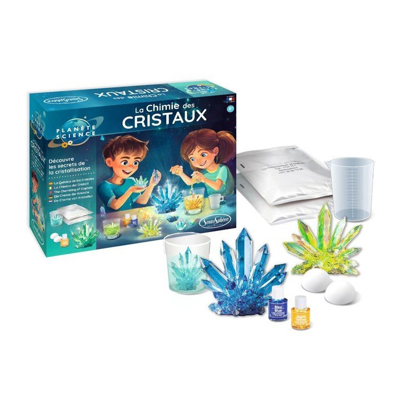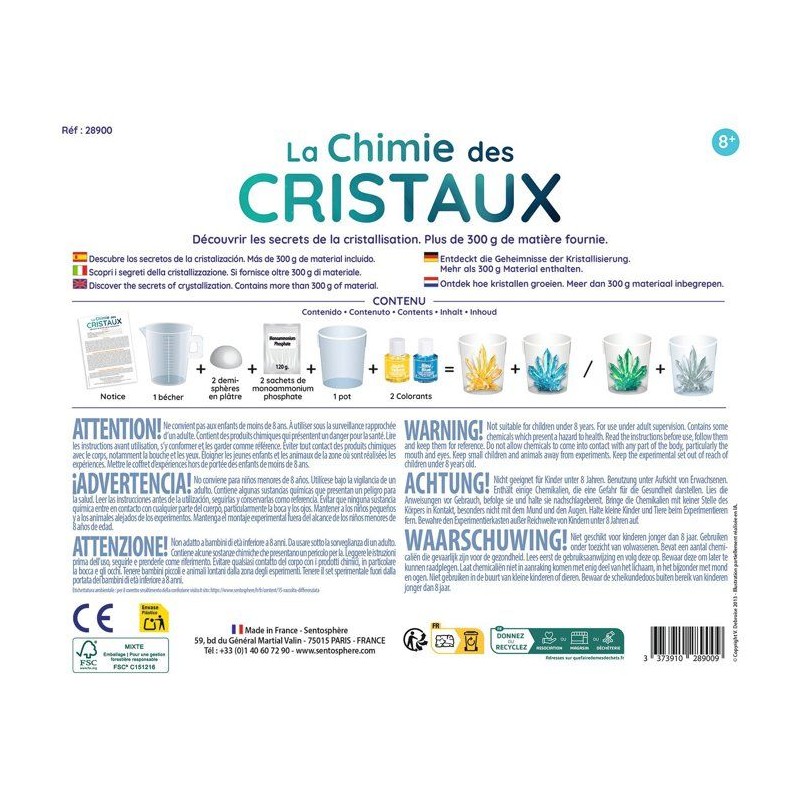 Avec 2 sachets de 120g de monoamonium phosphate, ce coffret permet de faire pousser des cristaux d'environ 5 cm, si beaux qu'on sera heureux de les garder précieusement dans sa collection de minéraux. Les cristaux seront bleus, jaunes, verts ou transparents. Grâce aux 2 expériences proposées, l'enfant comprendra qu'il faut tres peu de choses pour modifier les phénomenes de cristallisation car il n'y en a pas 2 identiques.