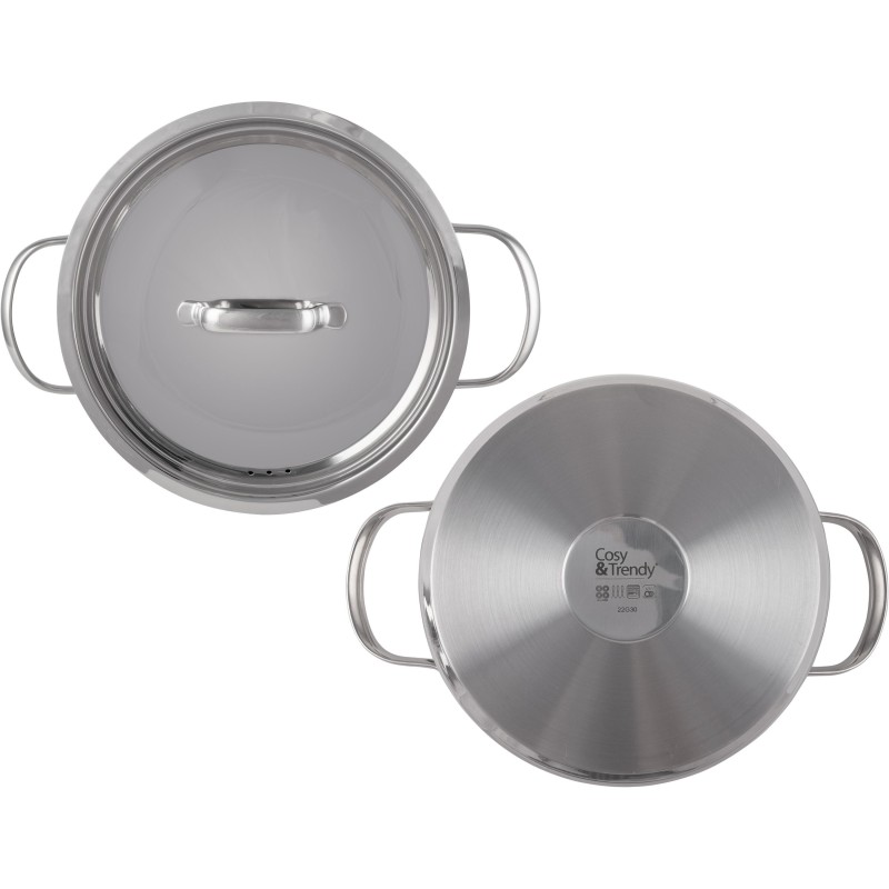 La série Daily en inox est un must pour tout cuisinier. Le fond en aluminium encapsulé assure une conduction thermique idéale et le trou de vapeur permet de réguler l'humidité. Toutes les poeles et casseroles sont brillantes a l'extérieur et mates a l'intérieur. Notez aussi l'indicateur de mesure pratique. Les poignées sont en inox et soudées a la casserole. Daily convient a toutes les plaques de cuisson (meme induction) et va au four jusqu'a 200°C. Cette série peut aller au lave-vaisselle.