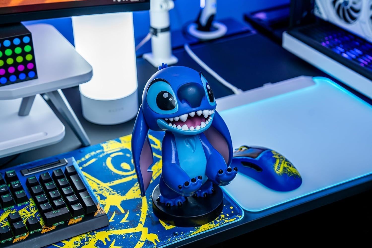 Avec son sourire malicieux et son énergie débordante, Stitch revient dans une version encore plus joyeuse ! Inspiré du film Lilo & Stitch, ce compagnon extraterrestre est pret a veiller sur vos manettes et smartphones avec style. Un accessoire fun et attachant qui apportera une touche de bonne humeur a votre setup gaming. Support universel et décoratif : conçu pour maintenir vos manettes Xbox One, PS5, Nintendo Switch ainsi que vos télécommandes ou smartphones. Compatible avec les modeles next-gen comme la DualSense PS5, Xbox Series X|S. Recharge simplifiée : il accueille la plupart des smartphones, meme avec une coque, et maintient votre appareil en toute sécurité pendant la charge. Un câble micro-USB de 2 metres est inclus, accompagné d'un adaptateur Lightning compatible avec vos différents appareils. Produit sous licence officielle : fabriqué sous licence Disney, cette figurine représente fidelement Stitch dans sa version Smiley, inspirée du film. Chaque détail est soigneusement travaillé pour ravir les fans du personnage.