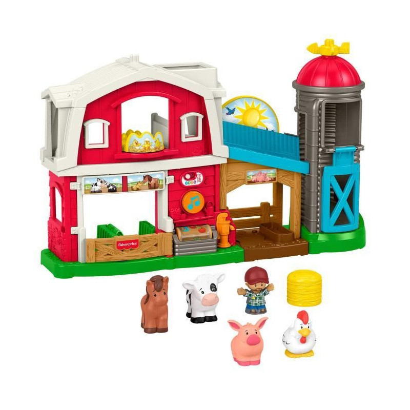La ferme Little People sons et lumieres est équipée de 5 figurines, 1 botte de paille, 1 bouton d'activation, un curseur pour les différents niveaux de jeu.