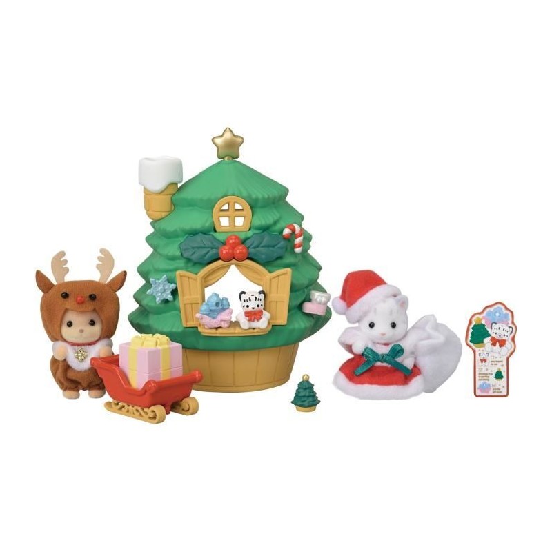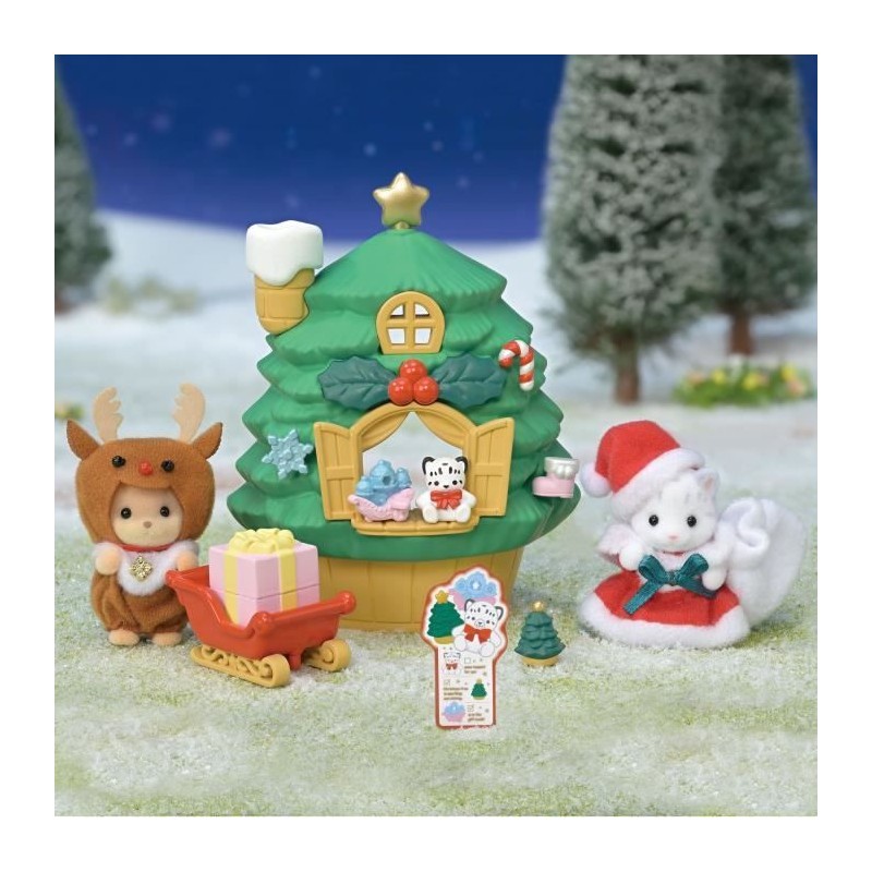 Ce coffret de Noël en édition limitée contient les bébés Panthere des neiges et Chien Caramel, une maison en forme de sapin de Noël, un traîneau et des accessoires. Les jouets peuvent etre rangés dans la hotte ou dans la boîte cadeau, le tout, transporté par le traîneau du Pere Noël. Le sapin peut etre décoré avec les différents accessoires. Les bébés portent des costumes exclusifs de Pere Noël et de renne. Ils sont articulés et habillés avec soin. Leurs vetements peuvent etre enlevés et remis a loisir.