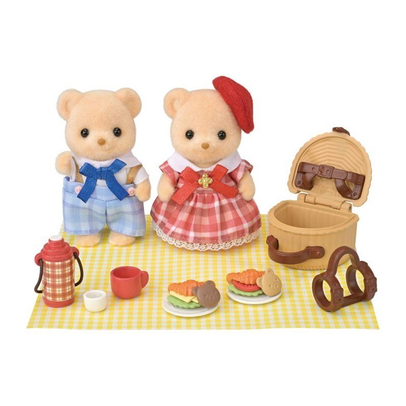 Ce coffret comprend le frere et la soeur Ours Biscuit, accompagnés de tout le nécessaire pour un délicieux pique-nique. Préparez de savoureux sandwiches en garnissant les croissants, et dégustez d'adorables biscuits en forme d'ours ! Rangez la vaisselle, les sandwiches et les biscuits dans le panier de pique-nique. La couverture de pique-nique se roule et se glisse dans son support. N'importe quel personnage enfant peut tenir le panier ou le support de la couverture. La gourde est accompagnée d'un petit gobelet qui s'emboîte a l'intérieur. Le frere et la soeur portent de jolies tenues a carreaux assorties. Ils sont articulés et habillés avec soin. Leurs vetements peuvent etre enlevés et remis a loisir.