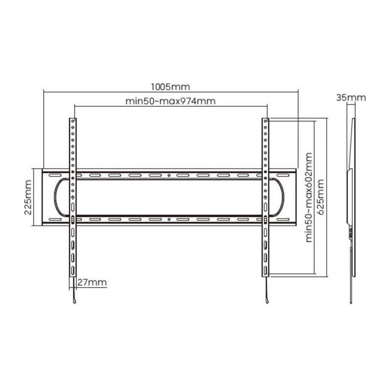 Support TV fixe SLIMStellSHO 7220 - Support fixe pour TV Taille min. de l'écran : 60" Taille max. de l'écran : 120" Distance min. du mur : 3,5 cm Distance max. du mur : 3,5 cm Charge max. : 120 kg Largeur : 1005 mm Hauteur : 625 mm Profondeur : 35 mm Espacement min. : 200x100 mm Espacement max. Espacement : 974x602 mm VESA 200x100 VESA 200x200 VESA 300x200 VESA 300x300 VESA 400x200 VESA 400x300 VESA 400x400 VESA 600x200 VESA 600x300 VESA 600x400 VESA 600x600 VESA 700x400 VESA 800x400 VESA 800x500 VESA 800x600 VESA 900x600 Couleur : Noir Matériau : Acier