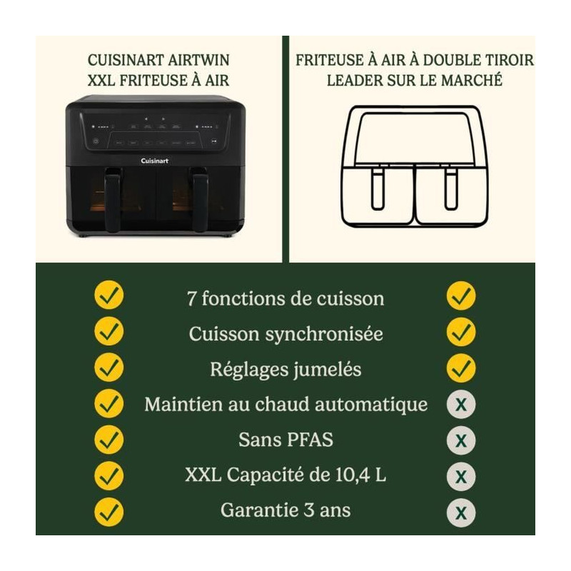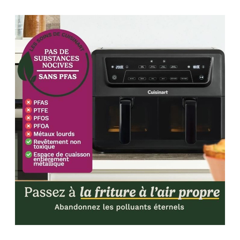 Découvrez la friteuse sans huile CUISINART Airfryer AFD10XBLE, votre alliée pour une cuisine saine et savoureuse ! Avec sa capacité XXL de 10,4 L et ses doubles cuves, préparez des repas pour toute la famille en un clin d'oeil. Dites adieu aux produits chimiques grâce a la cuisson sans PFAS. Profitez de 6 modes de cuisson : Air Fry, Rôti, Gril, Pâtisserie, Déshydratation, et Max Crisp. Les fenetres de visualisation vous permettent de surveiller vos plats sans ouvrir les paniers. La technologie Air Advantage(TM) garantit des résultats croustillants a l'extérieur et tendres a l'intérieur, avec peu ou pas d'huile. Facile a nettoyer, avec des pieces lavables au lave-vaisselle. Faites-vous plaisir sans culpabilité !