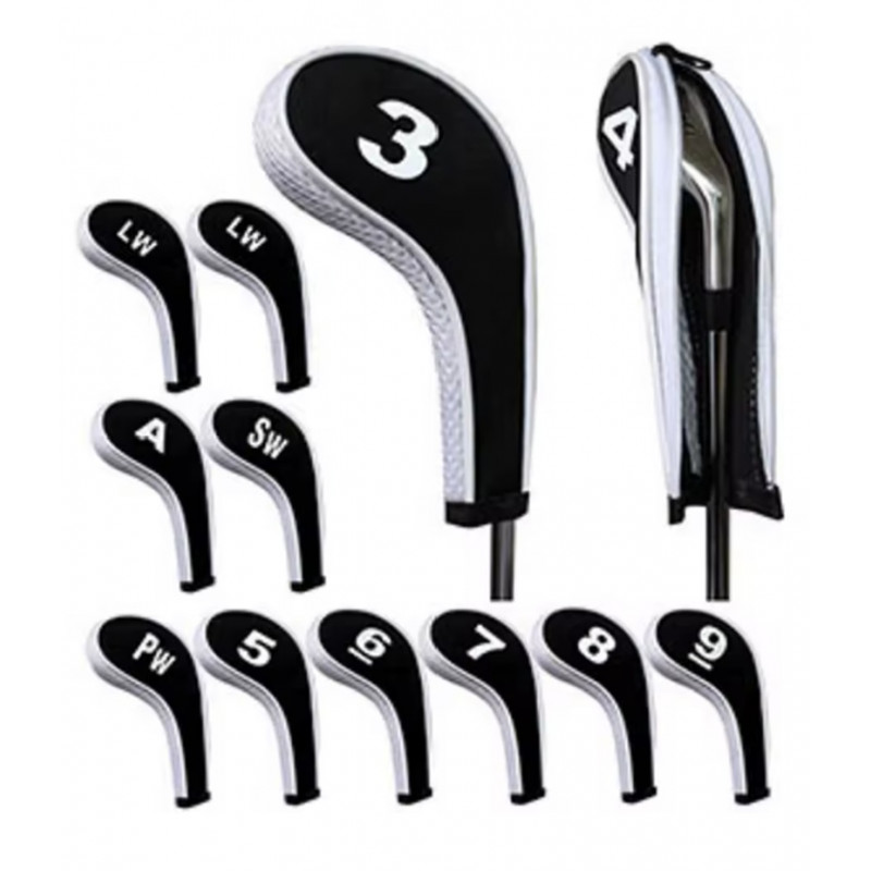 Set of 12 golf club iron head covers, 12 pieces, from 3 to LW with zipper.