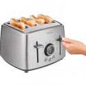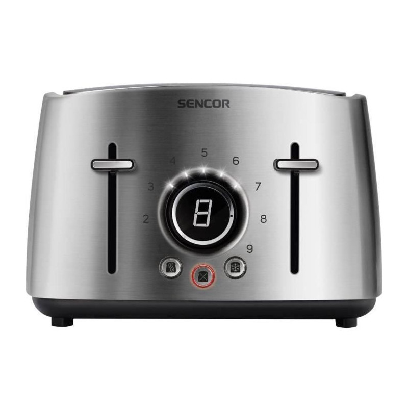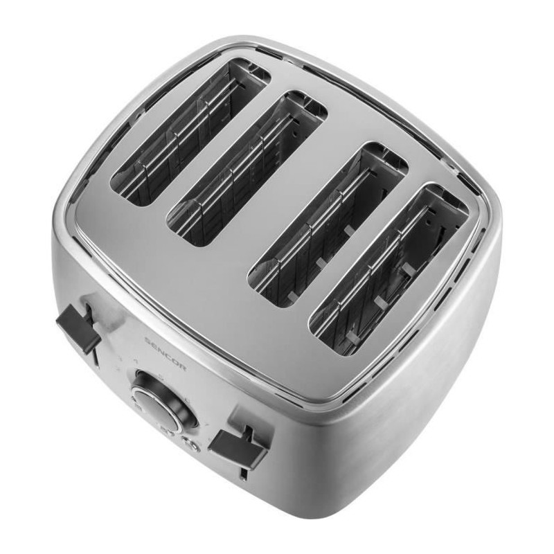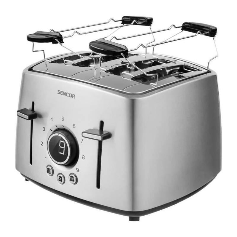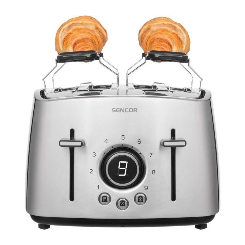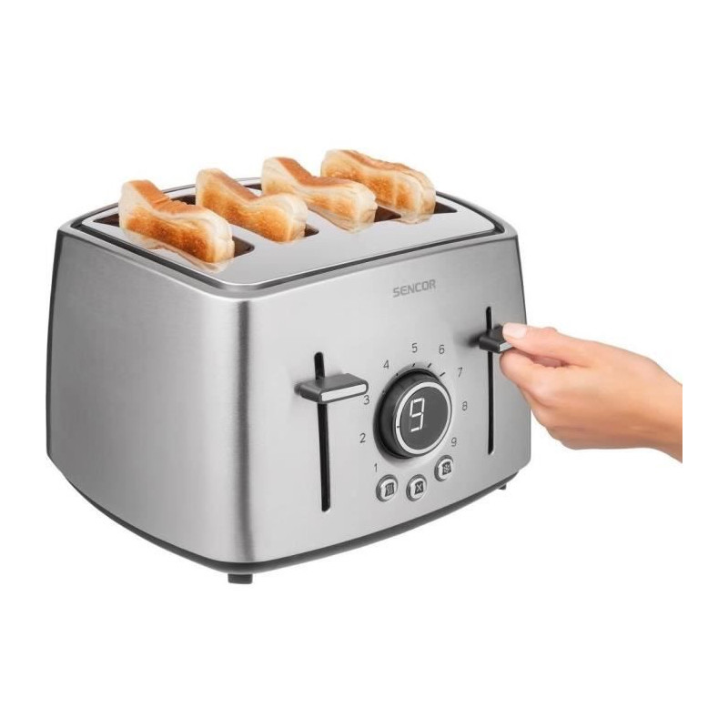 GRILLE-PAIN Sencor STS 5070SS - 4 fentes pour faire quatre tranches (longueur 135 mm) Design en acier inoxydable de qualité supérieure Grille-pain pour réchauffer et croustiller les petits pains Trois fonctions en une : réchauffage (avec voyant lumineux), annulation immédiate du fonctionnement avant la fin du temps défini, décongélation des produits a base de pain surgelés (avec voyant lumineux) Convient pour faire des toasts épais et fins Minuterie électronique - 9 niveaux d'intensité de grillage Éjection automatique du pain et arret apres la fin du grillage/décongélation Fonction de centrage automatique pour un grillage uniforme des toasts épais et fins Fonction de levage élevé pour un retrait facile des petits morceaux de pain Facile a nettoyer (plateau ramasse-miettes coulissant) Pieds antidérapants Espace de rangement du cordon d'alimentation Longueur du cordon d'alimentation : 100 cm Puissance absorbée : 1 600 W Dimensions (longueur x profondeur x hauteur) : 300 x 282 x 198 mm Dimensions avec chauffe-petits pains (longueur x profondeur x hauteur) : 300 x 282 x 250 mm Poids : 2,4 kg Tension et fréquence : 220-240 V, 50/60 Hz