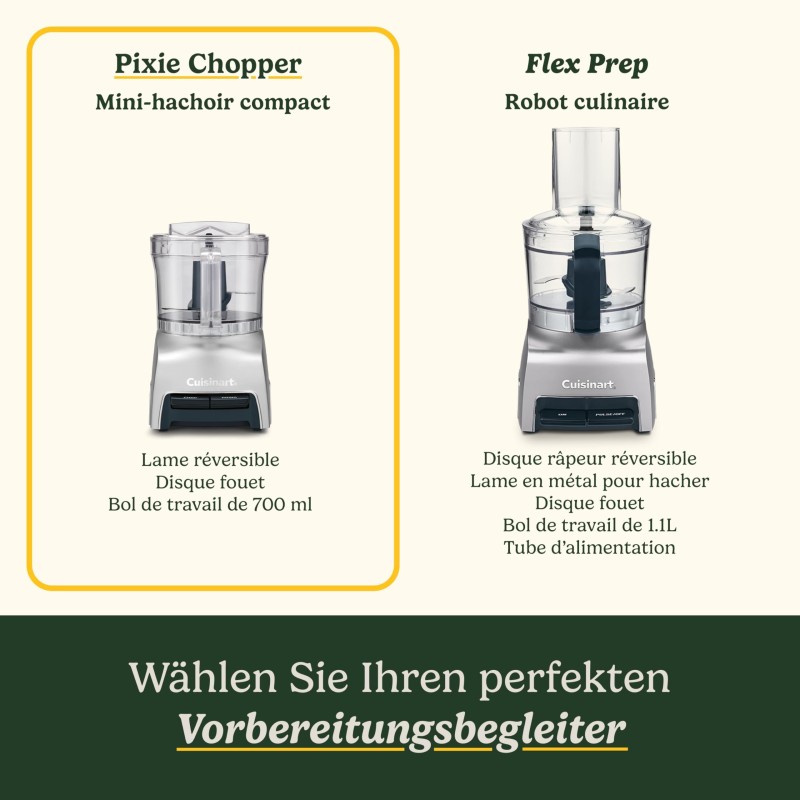 Compact, précis et ultra-efficace. Ce petit hachoir au grand potentiel est parfait pour hacher, fouetter ou broyer en quelques secondes. Son lame réversible brevetée en inox, sa lame SmartPower et son systeme BladeLock® garantissent sécurité et performance. Avec ses commandes simples par pression, le Pixie Chopper s'adapte a toutes les recettes, meme les plus express.