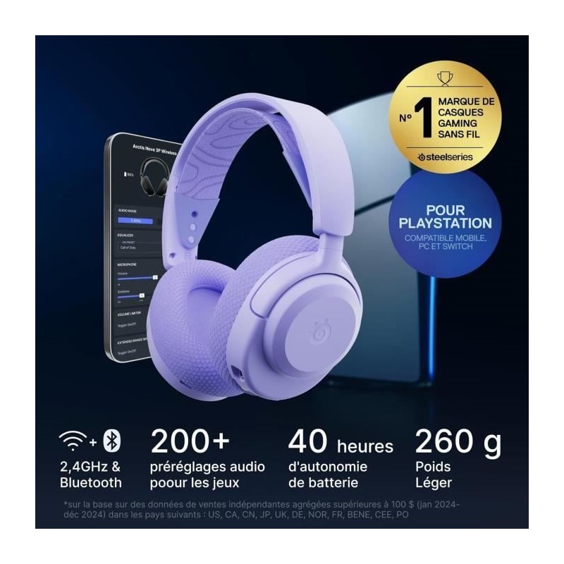 Le casque gaming sans fil STEELSERIES Arctis Nova 3PW offre jusqu'a 40 heures d'autonomie et une connexion 2,4 GHz pour une expérience de jeu immersive. Compatible avec PlayStation, PC et plus, il dispose d'une charge rapide et d'une qualité audio supérieure grâce a ses oreillettes en néodyme.