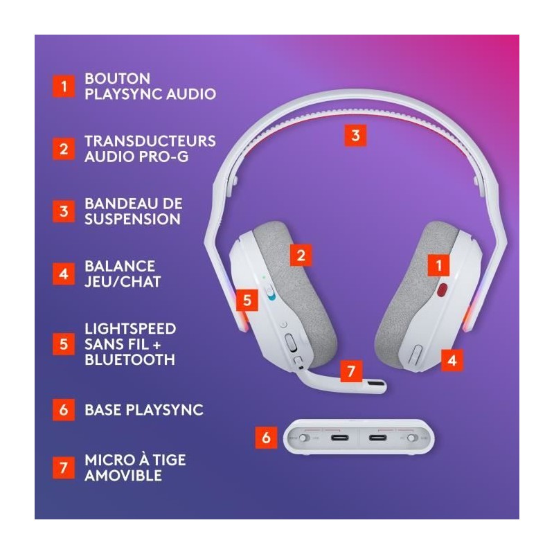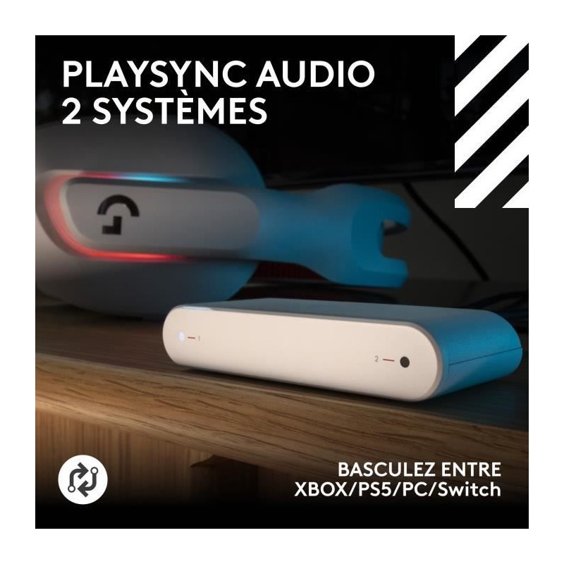 Logitech G Astro A20 X offre des fonctions gaming avancées a un plus grand nombre de gamers. Il s'agit de notre casque le plus abordable, doté de la technologie PLAYSYNC AUDIO deux systemes, qui vous permet de passer d'une console a l'autre d'une simple pression sur un bouton. Pour que vous puissiez jouer confortablement a tous ces jeux, A20 X est conçu avec des matériaux de qualité pour etre ultra-léger. Le microphone haute résolution 48 kHz et Blue VO!CE améliorent le son. Les joueurs peuvent également s'approprier l'A20 X et donner libre cours a leur style en personnalisant le LIGHTSYNC RVB sur le theme d'Astro et ses 16,8 millions de couleurs.