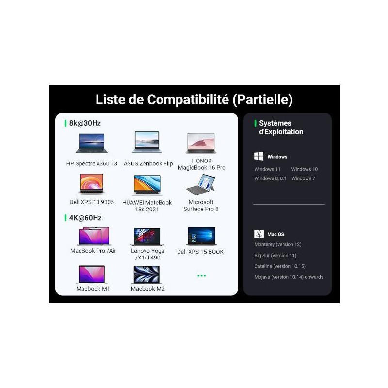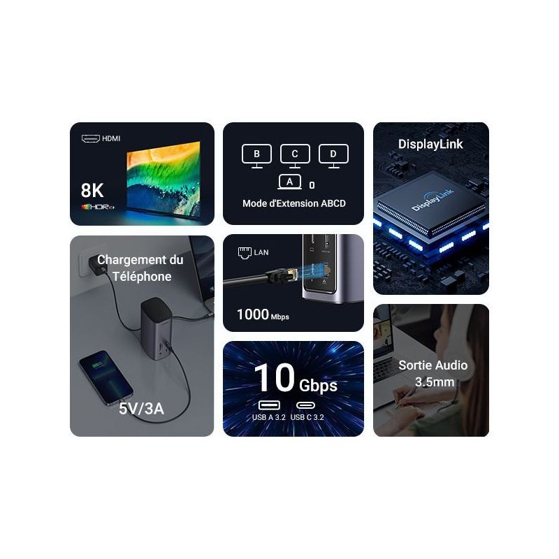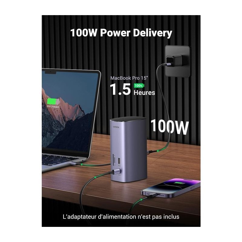 La station d'accueil multifonction USB-C Pro UGREEN transforme un port USB-C en une véritable station de travail complete. Elle inclut ports HDMI, USB-A, USB-C, SD/TF et RJ45 pour le réseau filaire, offrant une connectivité étendue pour tous vos périphériques. Son design gris élégant et compact optimise l'espace sur le bureau tout en garantissant une utilisation stable et sécurisée. Idéale pour les créateurs de contenu, télétravailleurs ou étudiants, cette station d'accueil facilite le transfert de fichiers, la connexion a des écrans externes et la gestion de tous vos périphériques depuis un seul port USB-C.