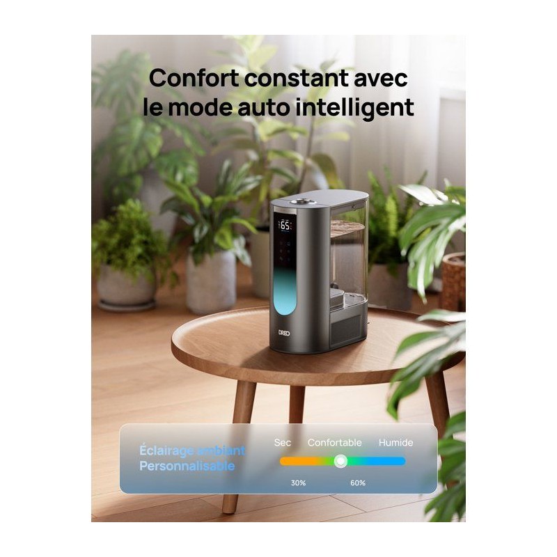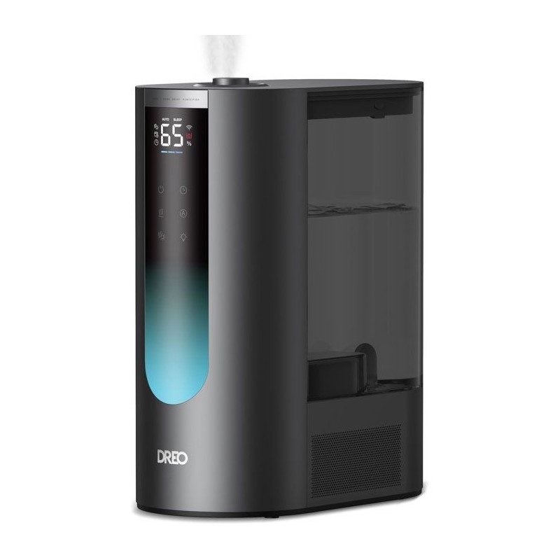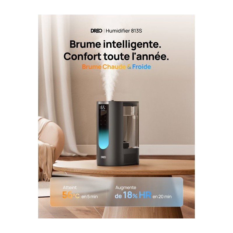 DREO HM813S - Brume chaude et froide pour un confort absolu toute l'année.Transformez votre intérieur en un espace sain et agréable grâce a l'humidificateur DREO HM813S, conçu pour offrir une humidification optimale en toute saison. Sa technologie avancée combine brume chaude et froide, vous garantissant un bien-etre sur mesure : chaleur apaisante en hiver, fraîcheur revitalisante en été. Avec son réservoir XXL de 6 litres, profitez jusqu'a 45 heures d'autonomie sans interruption. Besoin d'un confort immédiat ? Son systeme chauffe l'eau en 5 minutes seulement pour une brume chaude instantanée. Le mode automatique ajuste l'humidité avec précision, tandis que son fonctionnement ultra-silencieux (28 dB) préserve votre tranquillité, jour et nuit. L'HM813S allie design et praticité : remplissage par le dessus, nettoyage facile, et écran LED a luminosité réglable pour une utilisation intuitive. Ajoutez une touche sensorielle grâce a ses double compartiments pour pads aromatiques, et contrôlez-le a distance via commande vocale ou application mobile. Compatible avec les cartouches de déminéralisation, il assure une brume pure et prolonge la durée de vie de votre appareil. Élégant et performant, le HM813S est bien plus qu'un humidificateur : c'est votre allié bien-etre pour chaque saison. DREO HM813S - Respirez mieux, vivez mieux, toute l'année.