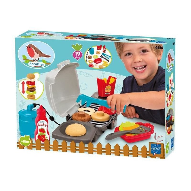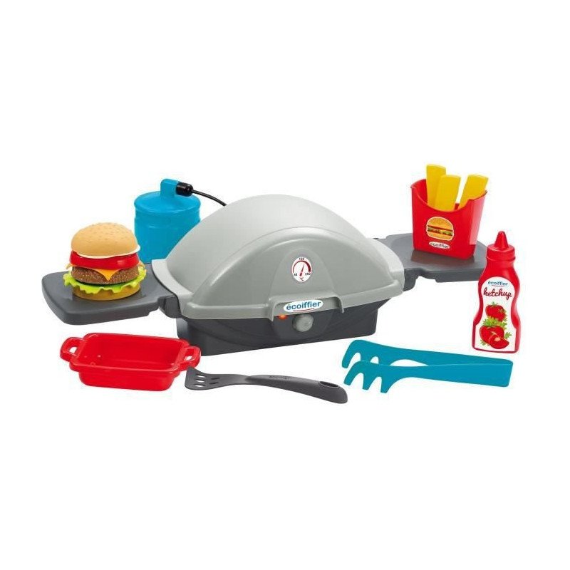 Barbecue a gaz comprenant de quoi faire cuire un hamburger, des frites, du ketchup, un plat, une spatule, une pince, une bouteille de gaz et son raccord. Conseillé des 18 mois. Origine France Garantie.