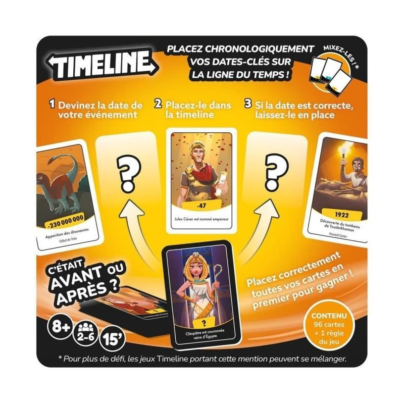 Découvrez le jeu de société Timeline Clutch Box FR, un jeu amusant et éducatif où vous devez placer des événements du monde des loisirs dans le bon ordre. Avec 96 cartes et des regles simples, ce jeu est parfait pour les adultes et les enfants a partir de 8 ans. Amusez-vous en famille ou entre amis !