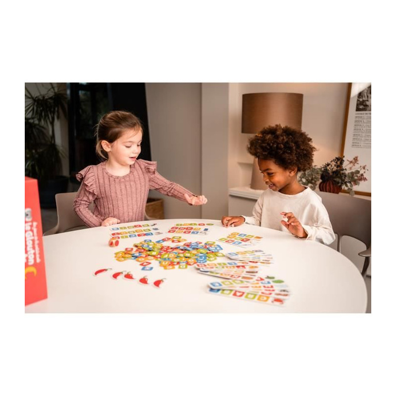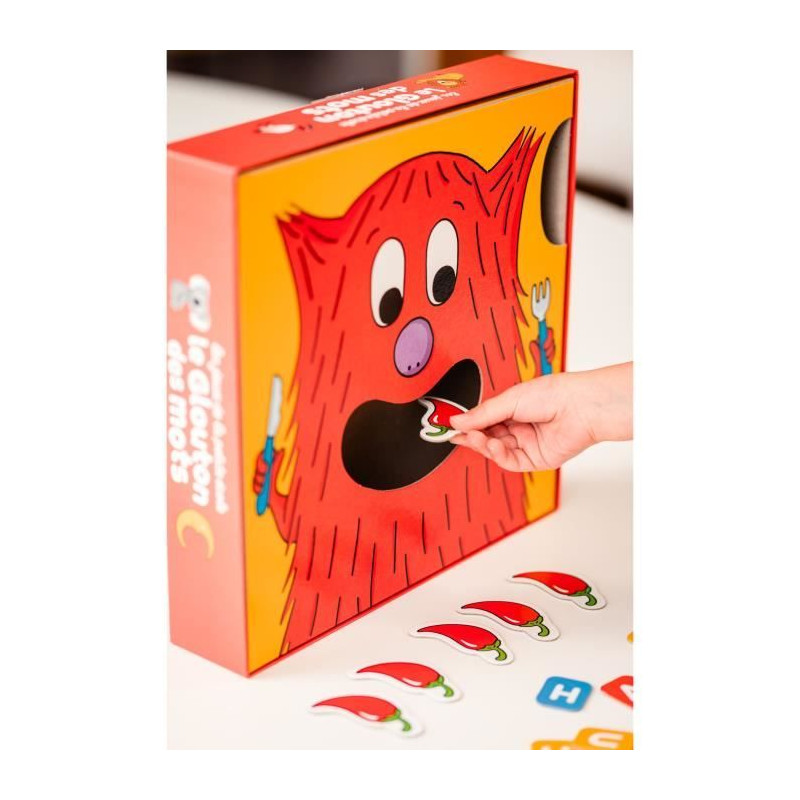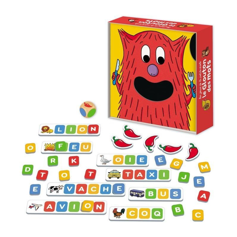 Dans ce jeu coopératif, les enfants doivent compléter 9 cartes-mots. On lance le dé : face couleur, on place une lettre manquante de cette couleur sur une carte s'il n'y en a pas, on relance. L'étoile permet de poser 2 lettres, et le piment est donné au Grand Glouton. Quand un mot est complété, il est "mangé" par le Glouton avec le mot dit a voix haute. Les enfants gagnent la partie s'il mange les 9 cartes-mots !