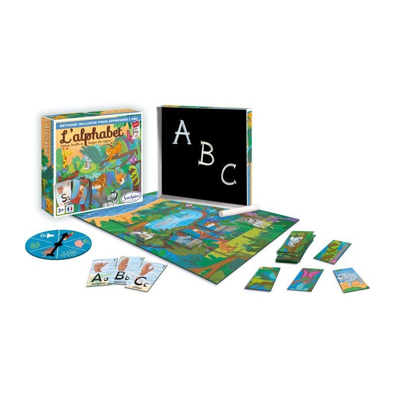 Des 3 ans, les enfants pourront découvrir l'alphabet, le braille et la langue des signes avec une méthode ludique et inclusive. Pour cela, ils se transforment en explorateurs pour découvrir les animaux qui se cachent dans la jungle du plateau. Grâce a plusieurs challenges, comme écrire la lettre sur l'ardoise, la reconnaître au toucher, la reproduire dans la langue des signes ou prononcer le son de la lettre. Si le challenge est réussi, l'animal apparaît sur le plateau ! Peu a peu, un abécédaire prend vie dans ce jeu éducatif et collaboratif.