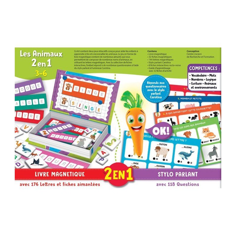 Une combinaison unique de deux grands classiques éducatifs !_x000B_Un coffret spécial qui réunit un jeu magnétique et le célebre stylo parlant Carotina._x000B_Un concept ludique et interactif signé Liscianigiochi, conçu pour stimuler la curiosité, la logique et l'apprentissage autonome a travers le jeu.