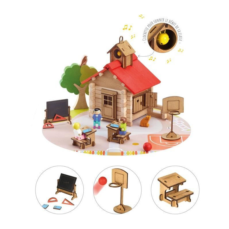 Découvrez le jeu de construction L'Ecole du Village de JEUJURA, composé de 125 pieces en bois naturel et teinté. Inclus : notice de montage, tapis de jeu et accessoires. Idéal pour les enfants a partir de 5 ans. Dimensions de la valisette : 32 x 27 x 11 cm.