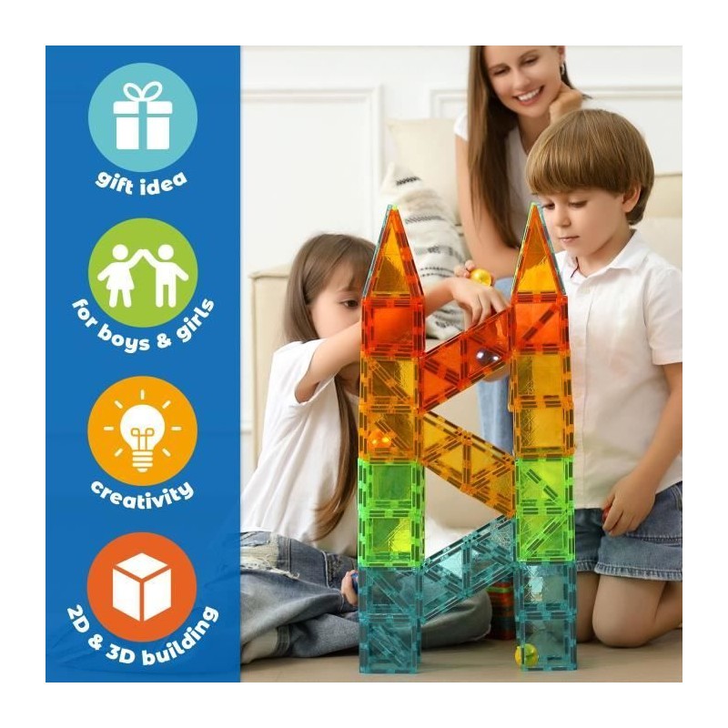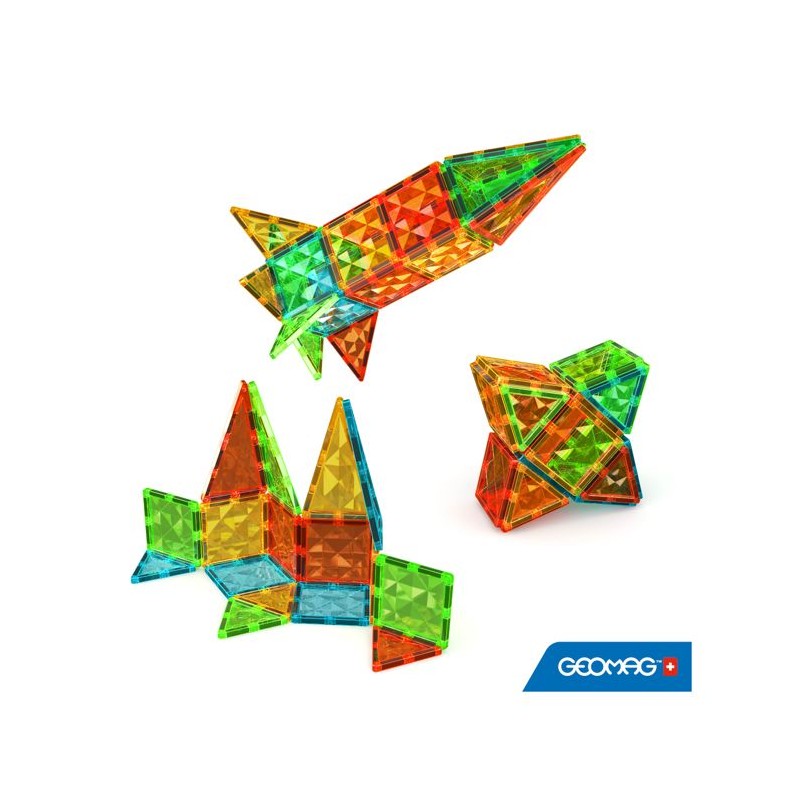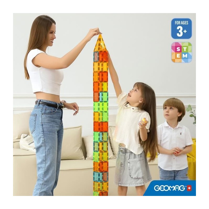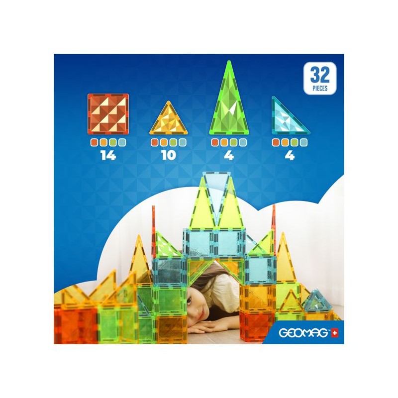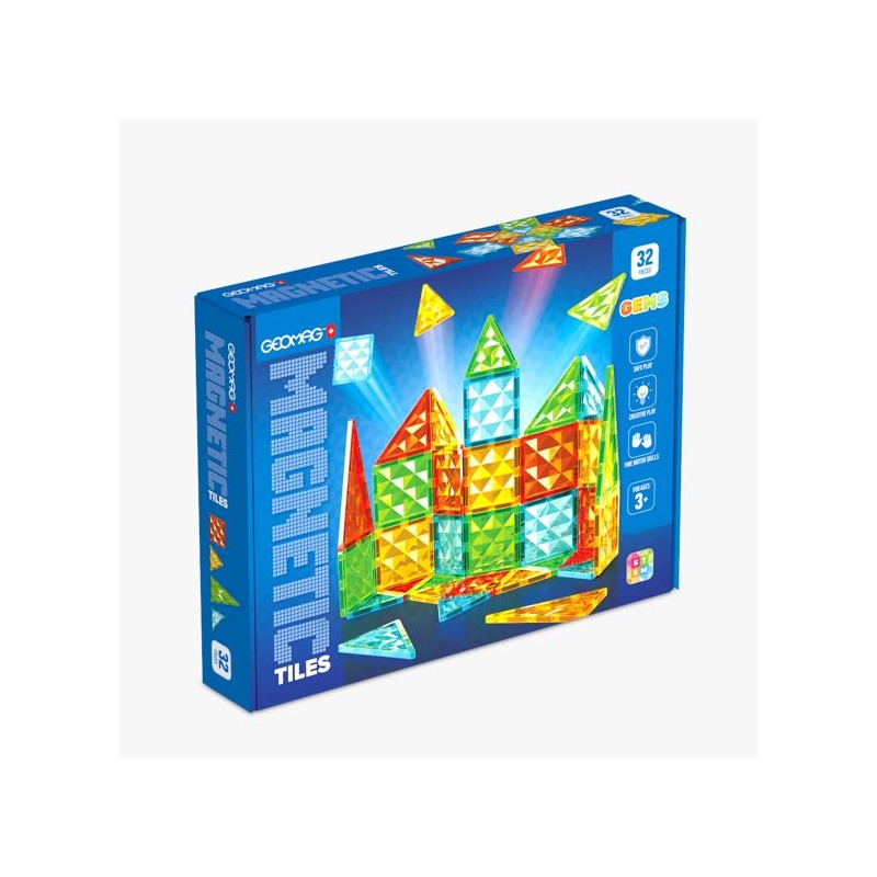 GEOMAG MAGNETIC TILES est une nouvelle plateforme de jeu basée sur des tuiles magnétiques amusantes et stimulantes de diverses formes géométriques dédiées a une cible préscolaire. Grâce aux tuiles magnétiques Geomag, les enfants peuvent librement laisser libre cours a leur imagination, créant de maniere dynamique des environnements et des scénarios de jeu en constante évolution : bâtiments, maisons, fermes, châteaux et paysages naturels. Cela permet a leurs jouets de prendre vie, transformant la chambre de votre enfant en une scene amusante et sûre pour des aventures sans limites. Les carreaux magnétiques Geomag présentent des textures de diamant originales dans des nuances lumineuses et translucides semblables a des pierres précieuses. Les toutes nouvelles tuiles magnétiques ont été soigneusement et magistralement conçues et fabriquées par Geomag grâce a des décennies d'expérience et de connaissances technologiques. Geomag, fabricant leader renommé de constructions et de jouets magnétiques depuis plus de 25 ans, propose et promeut une fois de plus une expérience de jeu de haute qualité axée sur la sécurité. ÂGE CIBLE 3+, DÉVELOPPEMENT DE LA MOTRICITÉ FINE, FORMES GÉOMÉTRIQUES MAGNÉTIQUES, VAPEUR/ÉDUCATIVE, ROBUSTE ET DURABLE, GARANTIE QUALITÉ ET GÉOMAG Le coffret de jeu 4101 comprend 32 tuiles magnétiques et combine un mélange de 4 formes : carré, triangle équilatéral, triangle isocele long et triangle isocele rectangle. L'ensemble est composé de 4 couleurs de gemmes transparentes : vert, bleu, jaune et rouge.