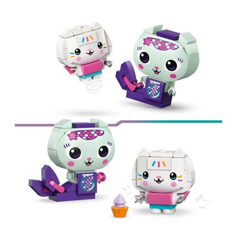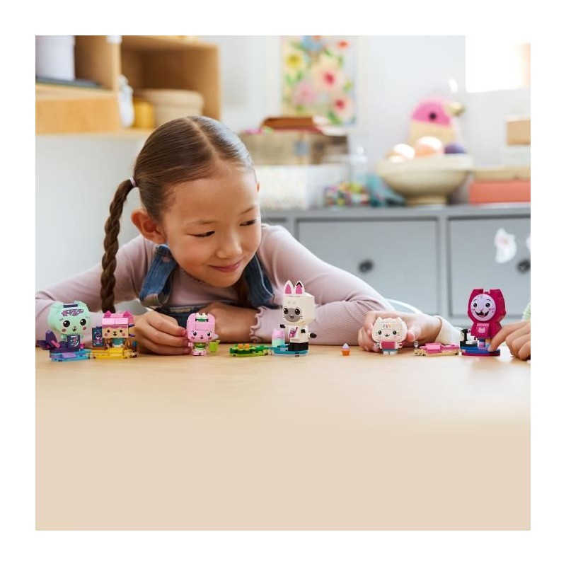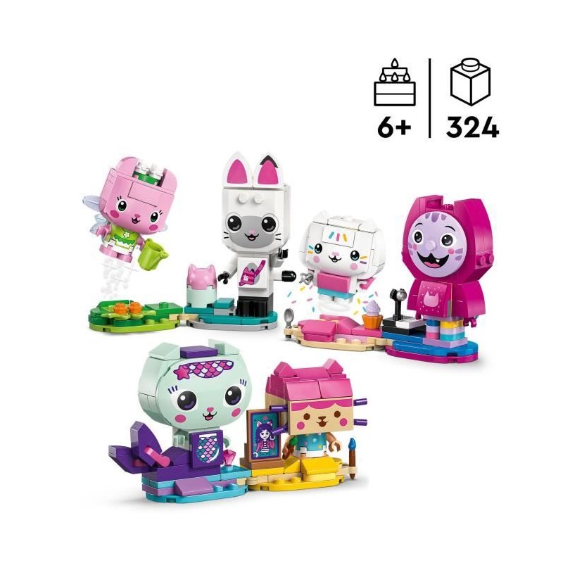 Les Gabbychats de Gabby et la maison magique a construire en briques LEGO® : Marine, « DJ » Miaou, P'tichou, Pandy Pattes, Fée Minette et Bébé Boîte.