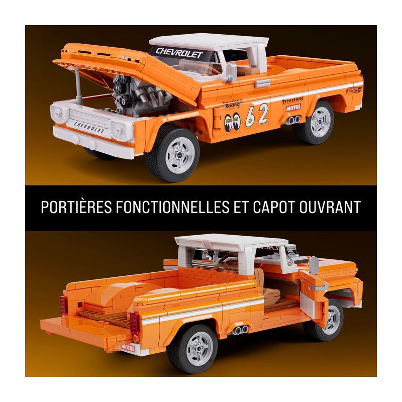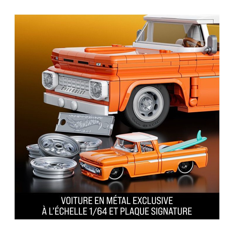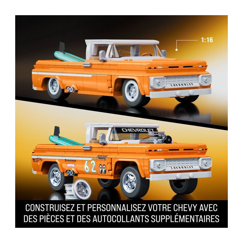Bouclez vos ceintures et prenez la route avec le Custom Chevy Pickup 1962 a l'échelle 1/16 a construire entierement de Mattel Brick Shop. Ce coffret détaillé et authentique contient des pieces supplémentaires pour plus de personnalisation, dont un moteur apparent, une feuille d'autocollants, des enjoliveurs en métal, une plaque signature, ainsi qu'une voiture en métal exclusive a collectionner et a exposer. Rassemblez toutes les voitures de la série Elite et construisez votre garage.