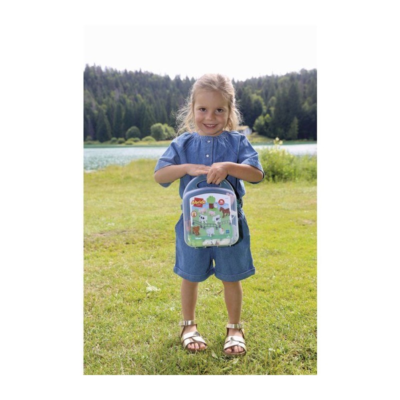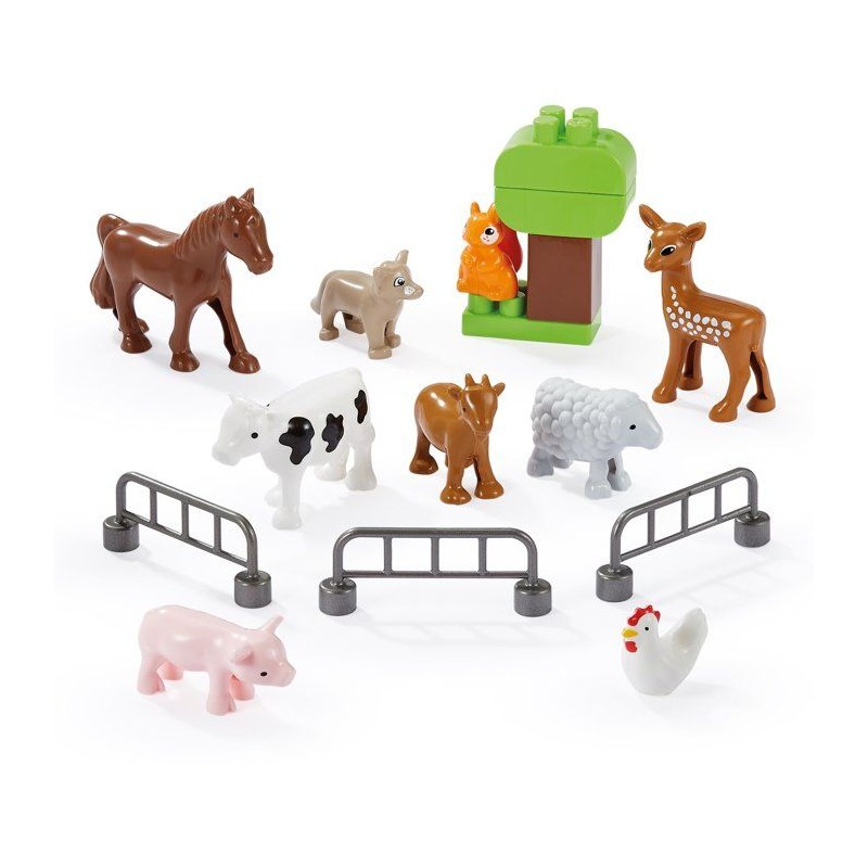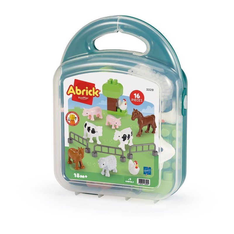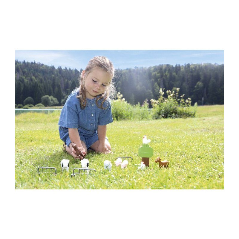Valisette comprenant 9 animaux de la ferme, 3 barrieres et 4 briques pour construire un arbre. Des 18 mois. Origine France Garantie.