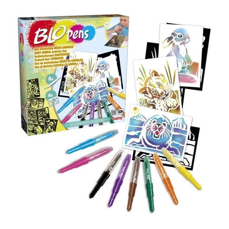 Les Blopens sont des feutres fantastiques - Utilise un pochoir, souffle dans le stylo et regarde ton dessin apparaître avec un effet aérographe - Découvre dans ce set des nouveaux pochoirs de bébé animaux trop rigolos - Pochoirs réutilisables - Bouchons lavables - Garçon et fille - Des 5 ans - Livré a l'unité