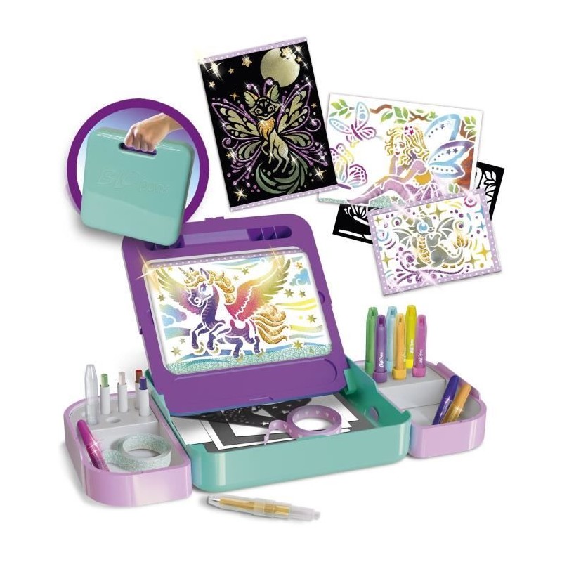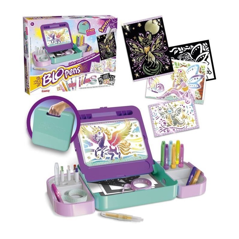 Amuse-toi a créer des dessins incroyables avec ton Coffret de Reve Fantastique ! Place ton pochoir sur le chevalet. utilise tes Blopens classiques. métalliques et magiques. et réalise des dessins époustouflants. Rajoute des rubans adhésifs imprimés pour créer ton propre univers de reve et des diamants colorés pour plus d'éclat et de brillance dans ton univers. C'est tellement amusant ! Le studio comprend des compartiments pour ranger tous tes Blopens. pochoirs. diamants. et bien plus encore. Pochoirs réutilisables. Bouchons lavables.