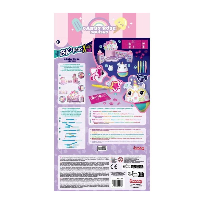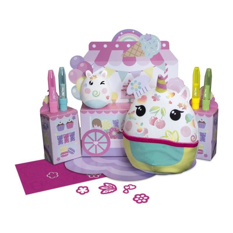 Prépare-toi pour une aventure magique avec Rose. la licorne Squishy dans son univers sucré ! Utilise tes Blopens et pochoirs pour styliser ta licorne comme tu le souhaites. Cette fois. Rose t'invite dans un monde gourmand rempli de douceurs et de surprises ! Pour un jeu de rôle encore plus immersif. le packaging et les accessoires sont sur le theme d'un univers enchanté de glaces et de friandises. où ta licorne peut etre la vedette. t'invitant a plonger dans un monde plein de couleurs et de gourmandises. En plus. découvre aussi le mini ami de Rose. donne-lui un prénom et commence a le décorer avec tes Blopens ! Tellement amusant ! Pochoirs réutilisables. Bouchons lavables.