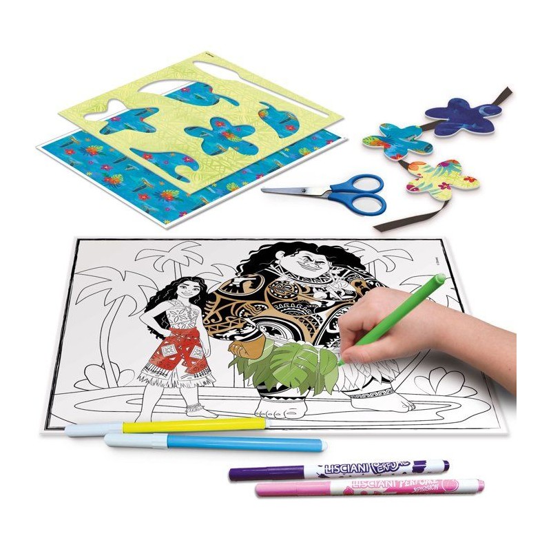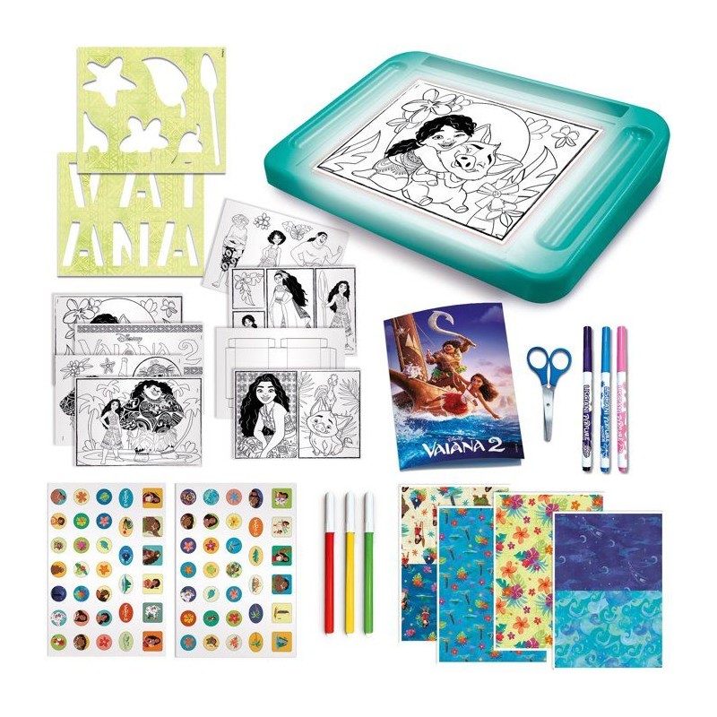 TABLE LUMINEUSE ÉCOLE DE DESSIN - Vaiana 2. Loisirs créatifs / Licence Disney Vaiana 2. Marque : Lisciani | Fabriqué en Italie. Un kit créatif original pour apprendre a dessiner comme de vrais artistes ! Grâce a la table lumineuse A4, l'enfant peut reproduire facilement les personnages et les images de Vaiana. Le kit inclut également des pochoirs, des autocollants, des marqueurs parfumés et des couleurs pour décorer et personnaliser ses créations. Contenu du kit :Table lumineuse pour dessin (format A4) - 8 feuilles a tracer - 3 feutres colorés - 3 feutres parfumés - 2 planches d'autocollants - 32 STRASS adhésives - 3 feuilles de motifs - 2 pochoirs - Poster a accrocher - Ciseaux - Ruban - Pochette de rangement - Feuilles blanches - Manuel d'instructions. Points clés: Table lumineuse A4 pour un dessin guidé et précis. Apprentissage guidé des personnages Vaiana. Personnalisation des créations (gemmes, autocollants, couleurs). Produit premium. Licence forte - nouveauté film Vaiana 2