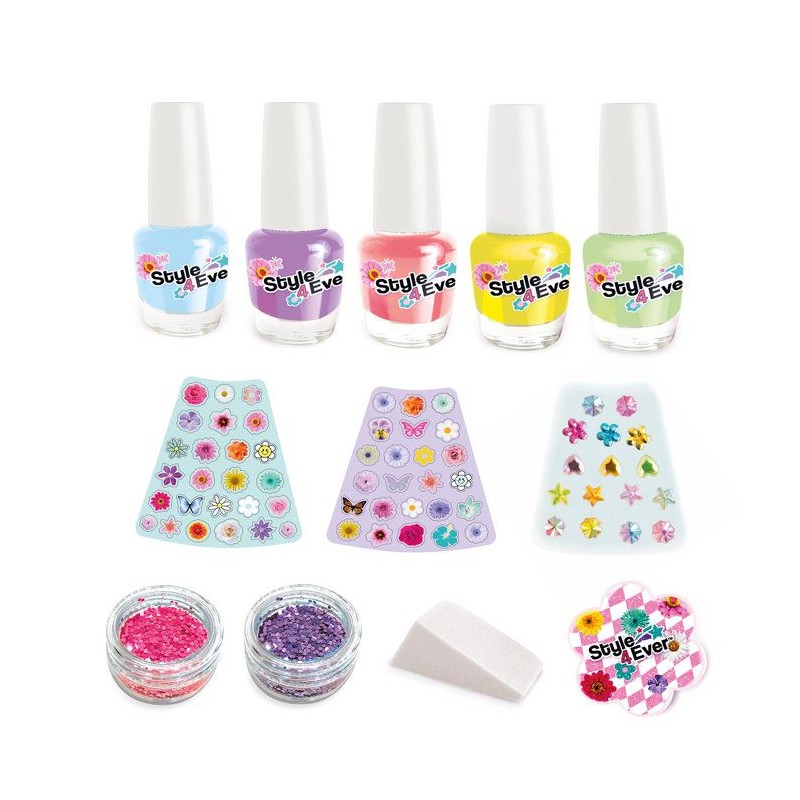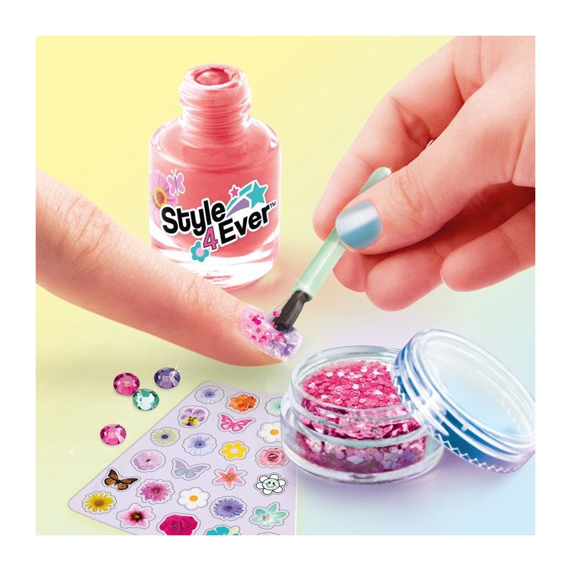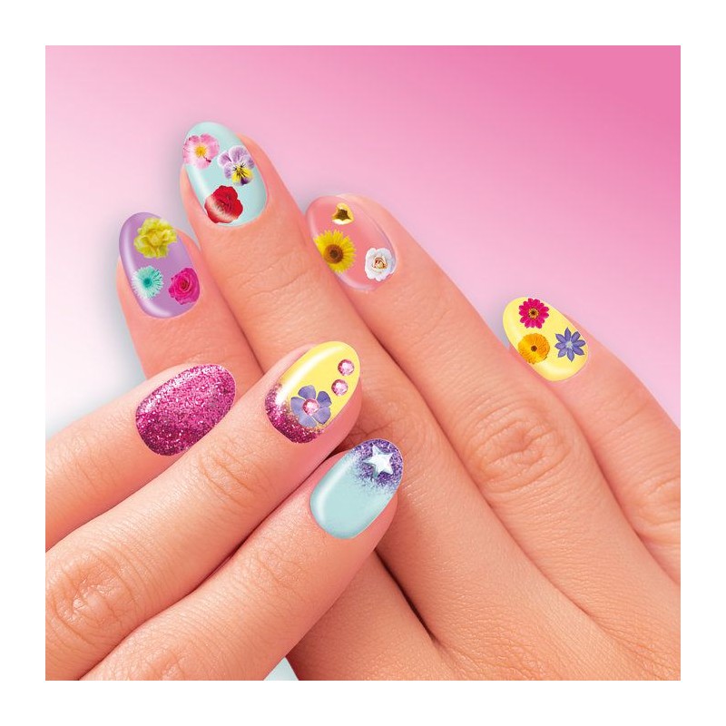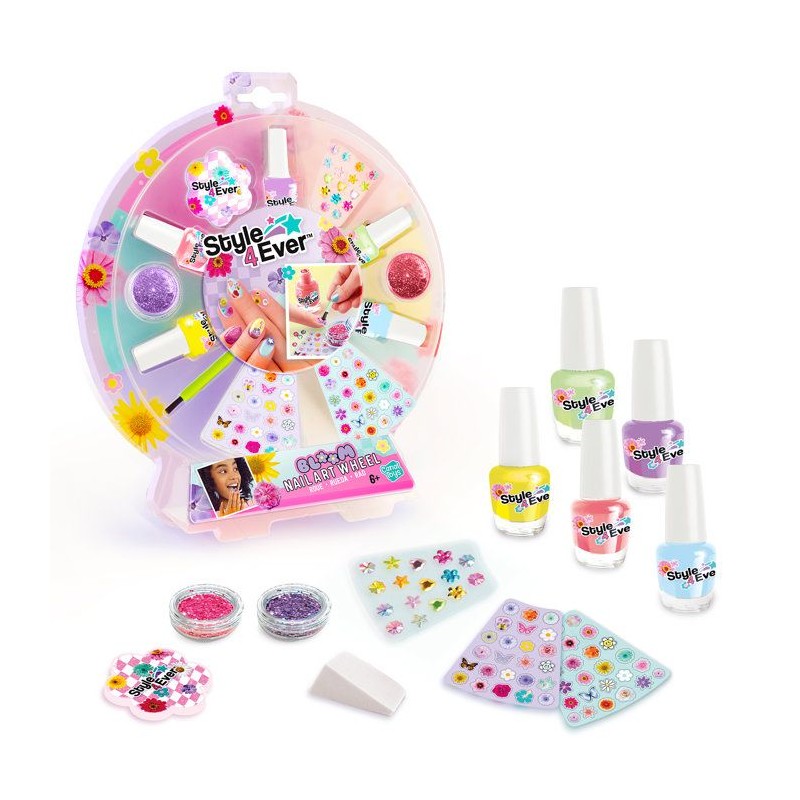 Avec la Nail Art Wheel, crée facilement une manucure fraîche, colorée et pleine de fantaisie. Ce coffret complet réunit tout ce qu'il faut pour personnaliser tes ongles dans un esprit fleuri et tendance, parfait pour le printemps ou pour toutes celles qui aiment les looks doux et pétillants. Tu trouveras a l'intérieur 5 vernis pastel, des paillettes, des stickers fleuris, une éponge pour créer des effets ombrés, une lime, une brosse a paillettes et meme une planche de strass autocollants. Il te suffit de choisir un style, de poser tes couleurs, d'ajouter des effets et de décorer selon tes envies. Résultat : une manucure brillante, fun et totalement unique. Pas besoin d'etre une pro ! L'éponge et la brosse permettent de réaliser facilement des effets dégradés ou scintillants, et les stickers comme les strass se posent directement sur l'ongle, sans colle. C'est simple, amusant, et parfait pour les enfants a partir de 8 ans. Ce kit est idéal pour s'amuser seule ou avec ses copines lors d'un apres-midi créatif. En plus, tous les accessoires sont adaptés aux petites mains pour une prise en main facile et agréable. Contenu du coffret : 5 vernis pastel, 2 pots de paillettes, 1 éponge, 1 lime, 1 brosse a paillettes, 2 planches de stickers fleurs, 1 planche de strass adhésifs, 1 fiche d'instructions. Dimensions de la boîte : L28 x P25 x H18,5 cm Conforme aux normes européennes du jouet