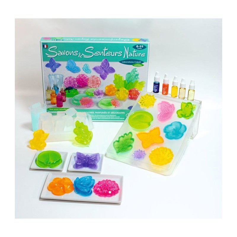 Un coffret DIY pour faire de beaux savons multicolores sur le theme de la nature : nénuphars, lotus, papillons ou grenouilles. Tres facile d'utilisation car tous les accessoires ont été pensés pour faciliter la création. La base glycérinée fond au bain-marie ou au micro-ondes, se parfume et se colore suivant une palette de couleurs acidulées suggérées dans le mode d'emploi. Des recharges permettent d'utiliser longtemps ce coffret dans une logique d'éco-conception. Des savons tres doux, parfaits pour un usage quotidien ou faire des petits cadeaux.