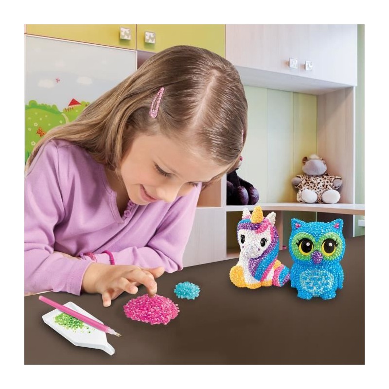 Créez des figurines scintillantes (licorne, hibou, coeur...) avec 12 couleurs de cristaux irisés ! Processus simple : posez les cristaux, utilisez l'outil fourni, et admirez vos oeuvres sous tous les angles. Yeux autocollants inclus pour personnaliser. Expérience artistique unique pour enfants !