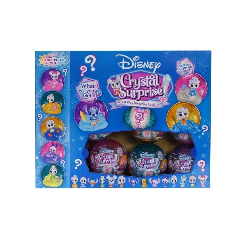 Chaque Boule Surprise Crystal contient : 1 figurine en cristal, 1 sachet de slime ou 1 sachet de CraZSand, et 2 petits accessoires Amusez-vous avec vos personnages Disney préférés et collectionnez-les !