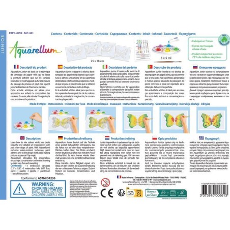 Fantastique ! Quelques gouttes de peinture et tous les enfants pourront réaliser de véritables chefs-d'oeuvre. Aquarellum Junior est basé sur une technique, créée par Véronique Debroise, de sertissage sur papier vélin, qui ne laisse la peinture adhérer que sur des surfaces réservées. Le motif apparaît au fur et a mesure du passage du pinceau et peut etre repeint jusqu'a ce que le tableau soit parfait. Une activité idéale pour initier les enfants a l'art en comprenant le mélange des couleurs, stimuler l'imaginaire et la concentration.