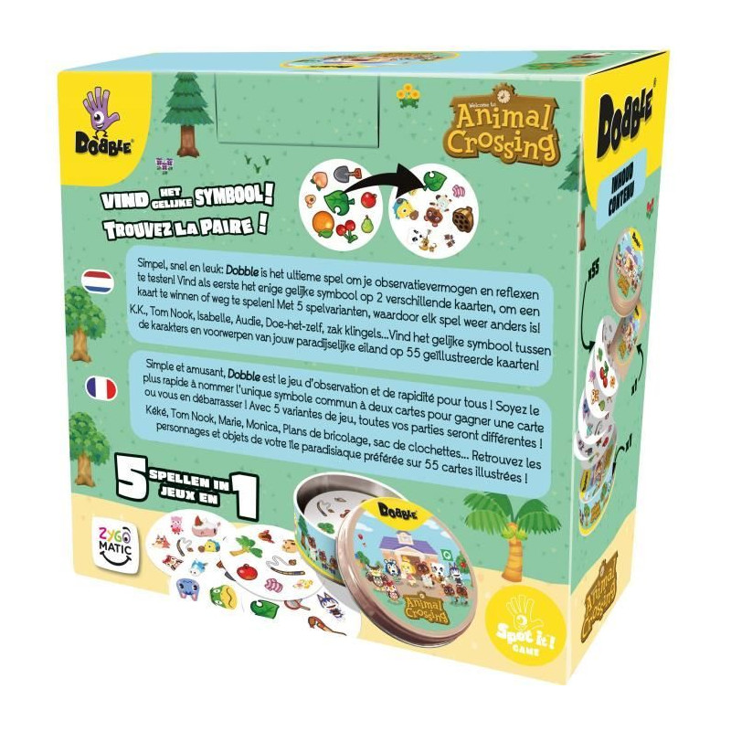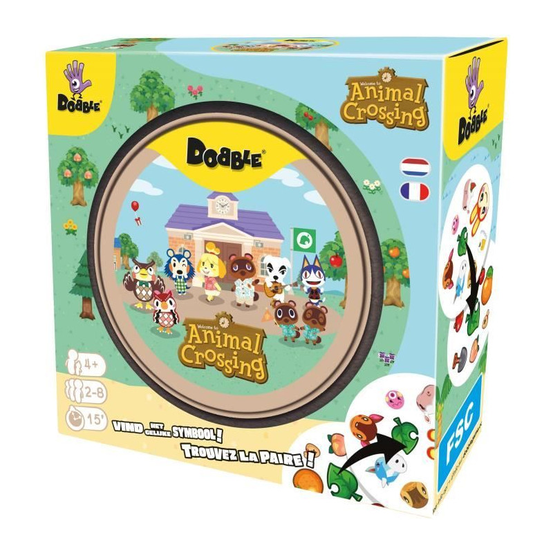 Découvrez le jeu Dobble Animal Crossing avec tous les personnages emblématiques de la série. Affrontez vos amis pour repérer les symboles communs entre les cartes dans 5 minis jeux. Idéal pour les fans de Nintendo, a partir de 4 ans et pour 2 joueurs ou plus.
