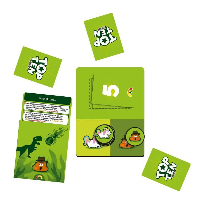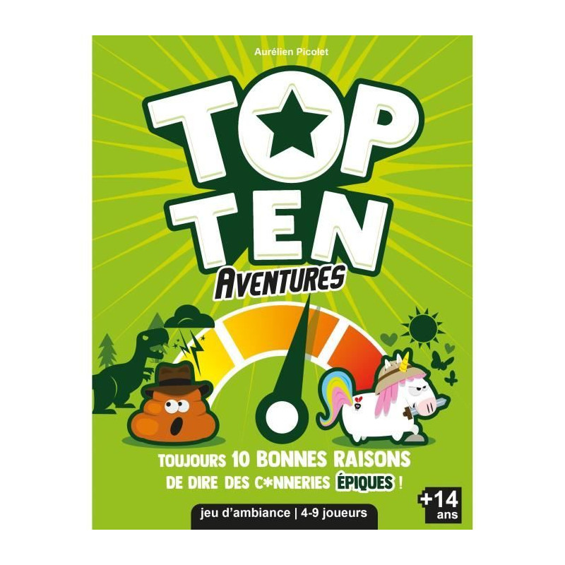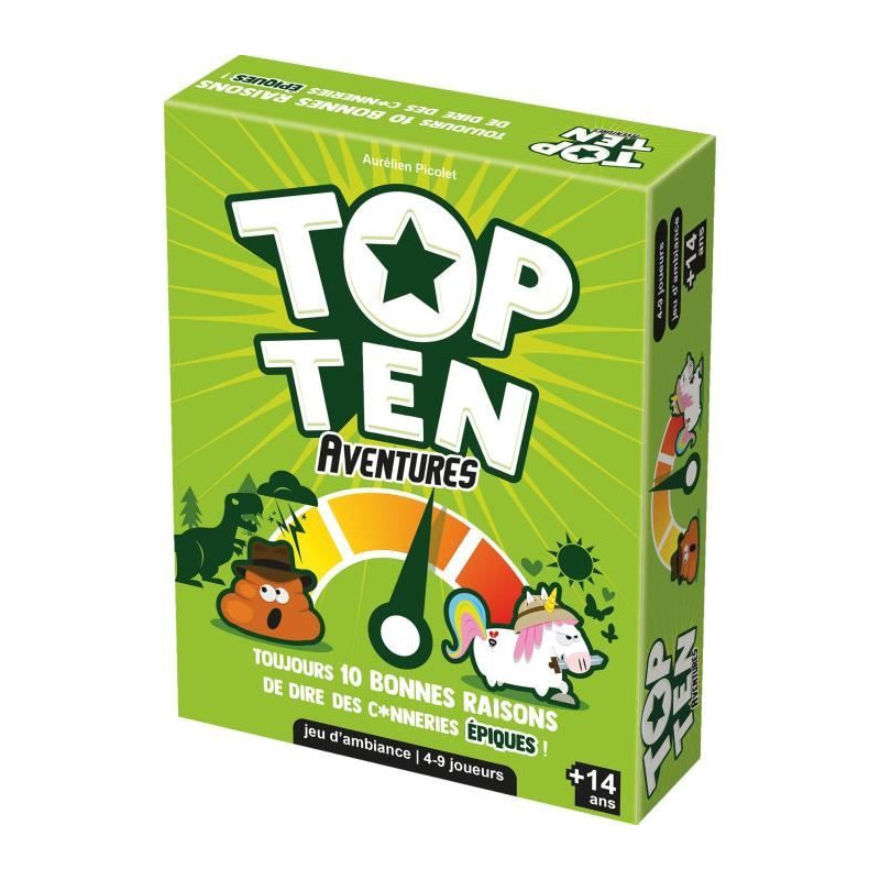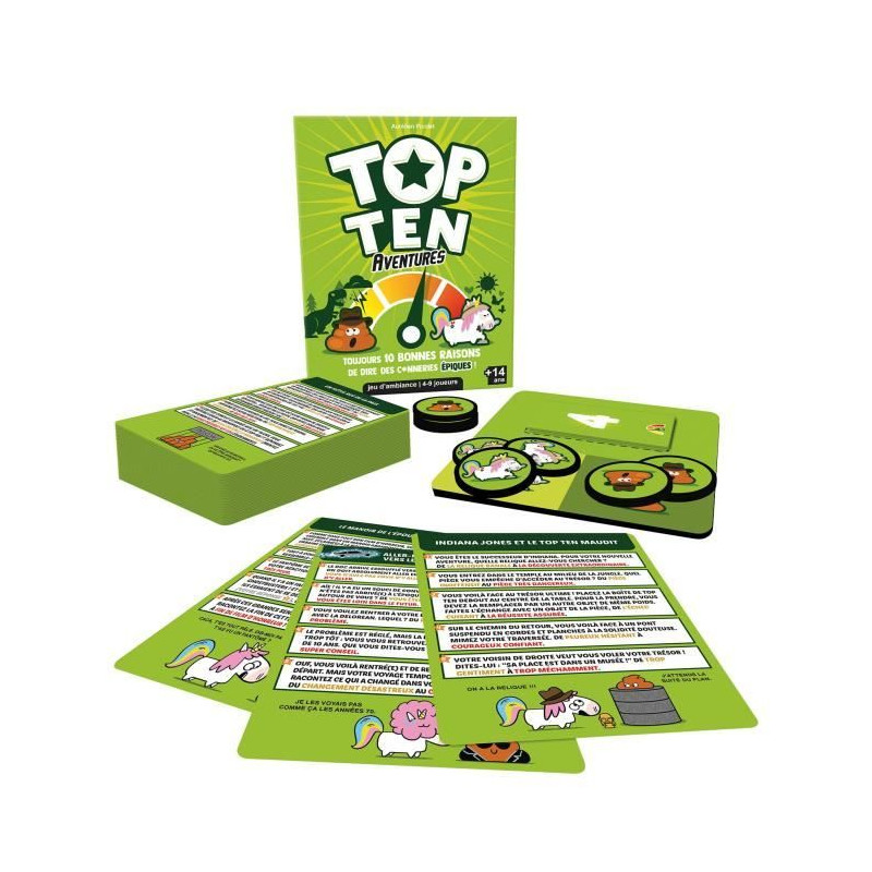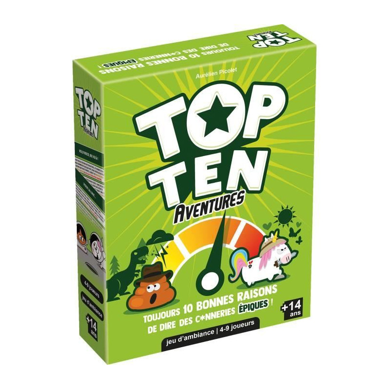 Top Ten Aventures est un jeu d'ambiance coopératif où votre équipe doit classer des réponses loufoques selon un critere secret. Avec des scénarios uniques et des éclats de rire garantis, ce jeu est parfait pour des soirées entre amis. Idéal pour les adultes a partir de 16 ans, il se joue de 4 joueurs ou plus en 30 minutes.