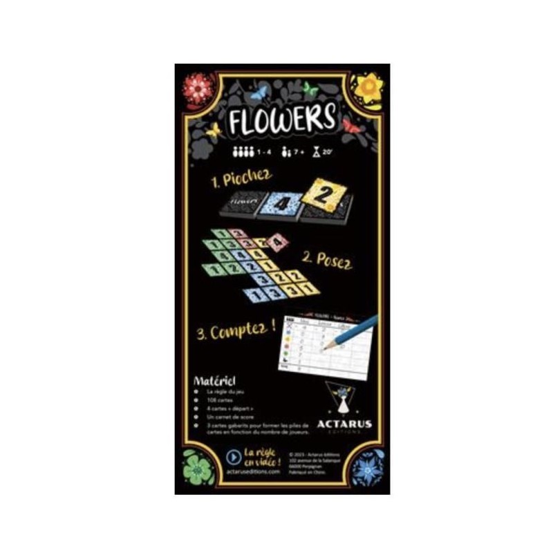 Découvrez le jeu de société Flowers - Actarus edition, un jeu de réflexion et stratégie pour enfants a partir de 6 ans. Composé de 108 cartes, il se joue en 30 minutes pour 2 joueurs ou plus. Formez des groupes de couleurs pour gagner et amusez-vous en enchaînant les parties !