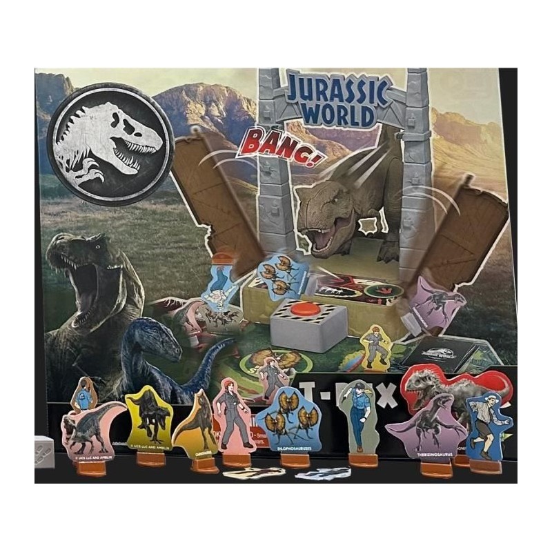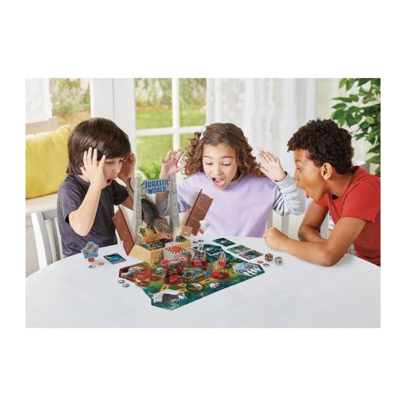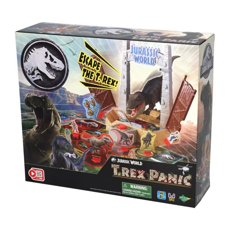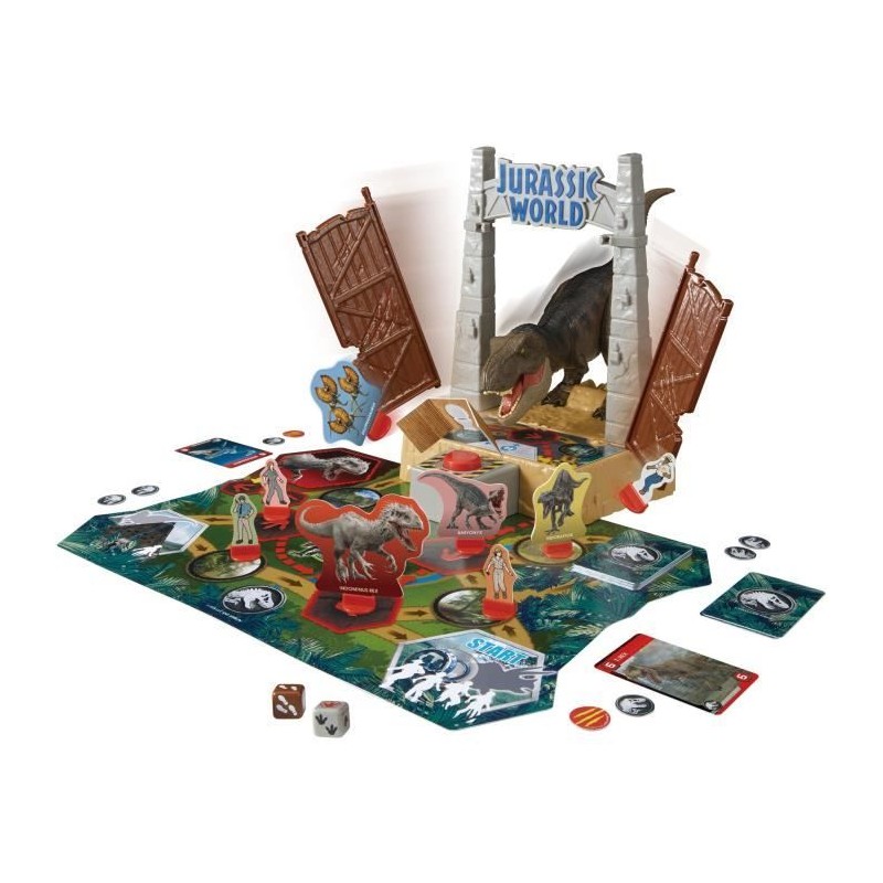 Dans Jurassic World T-Rex Escape, lancez le dé et avancez sur le plateau. Évitez la zone périlleuse où un T-Rex peut vous renvoyer au départ! Tirez des cartes a chaque tour et accumulez des points pour gagner. Un jeu d'action et de réflexe pour toute la famille, a partir de 5 ans.