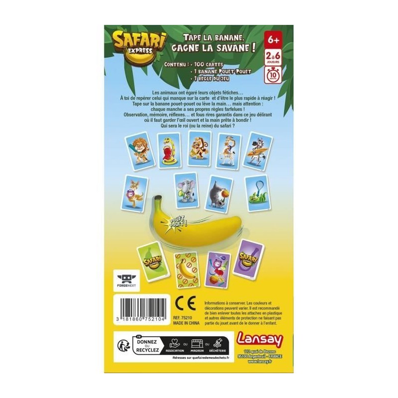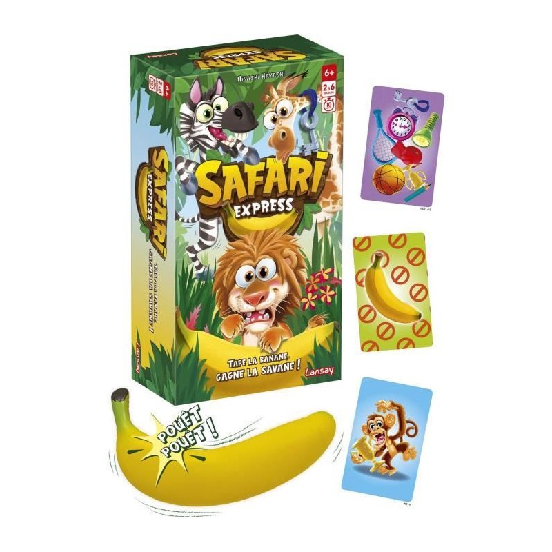 Bienvenue dans la savane... mais attention. un objet a disparu ! a toi de l'identifier avant les autres... et surtout. de réagir avec la bonne regle ! Observe la carte Objet : 8 objets y sont dessinés... mais il en manque un ! Lequel ? Regarde la carte Banana : elle te dit comment réagir : tape sur la banane pouet pouet. leve la main. donne le nom de l'animal qui a perdu son objet ou attrape la banane sans réfléchir. a chaque manche. les regles changent ! Fous rires. suspense et rebondissements garantis. Mais attention : si tu te trompes... tu perds une carte ! Un jeu ultra fun melant observation. mémoire et réflexes. pour des parties courtes et super rythmées des 6 ans.