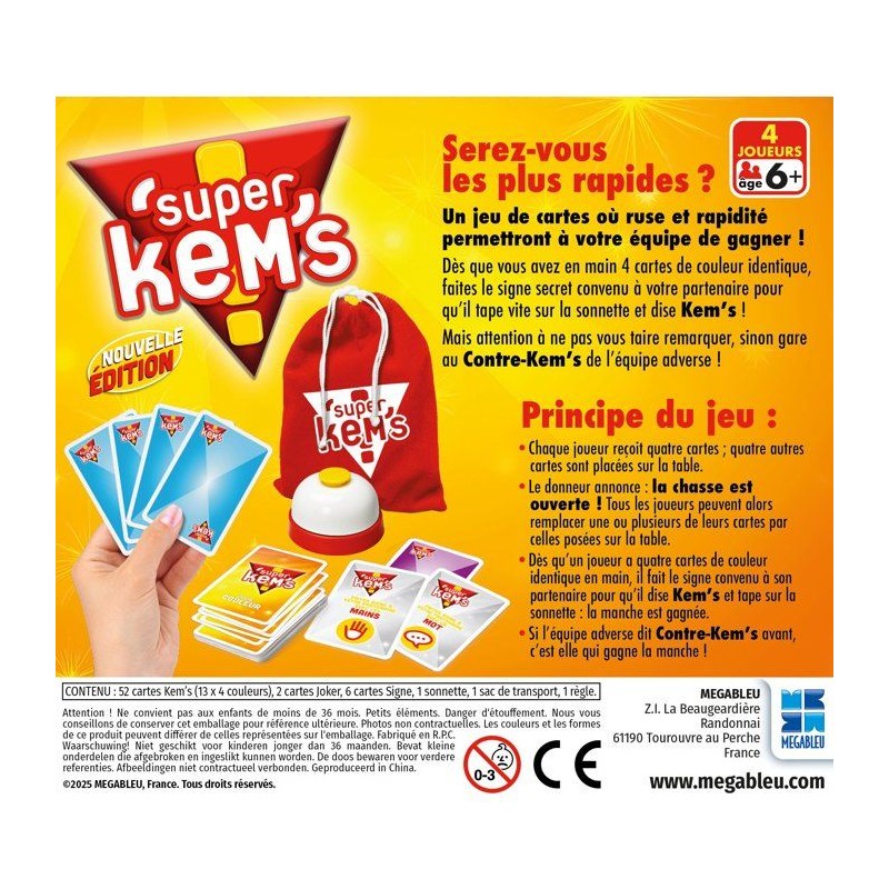 Great classic brought up to date - The principle is simple: gather 4 identical cards as quickly as possible and then discreetly signal to your partner - 4 players - Content: 52 Kem's cards, 6 Sign cards, 2 Joker cards, 1 doorbell - Boy and Girl - From 6 years old - Delivered individually