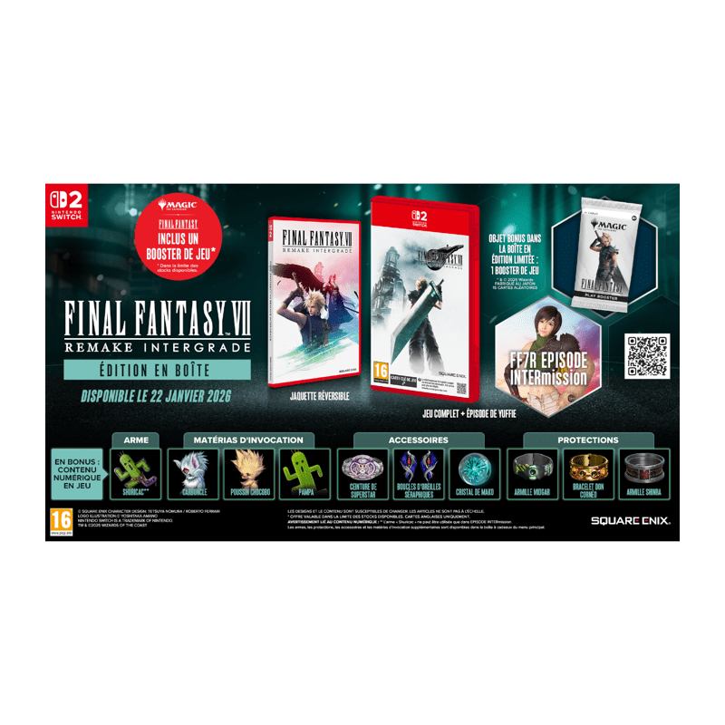Le jeu primé FINAL FANTASY VII REMAKE INTERGRADE* est une réinvention de l'histoire originale, jusqu'a la fuite de Midgar, accompagnée de graphismes époustouflants, d'un gameplay palpitant, et de nouveaux éléments de scénario. En plus d'une histoire inoubliable et de personnages attachants, ce RPG propose un systeme de combat hybride mélangeant action en temps réel et stratégie axée sur les commandes. Il inclut aussi FF7R EPISODE INTERmission, une histoire annexe suivant les aventures de Yuffie Kisaragi en parallele de celles de Cloud. HISTOIRE La mako, le sang de la planete, est une source d'énergie tres convoitée. La Shinra exploite, puise et raffine cette essence afin d'alimenter ses réacteurs, gagnant en puissance jusqu'a contrôler la quasi-totalité du monde. Mais la résistance gronde. Une bande d'idéalistes hétéroclites, Avalanche, est déterminée a protéger la planete. Dans la ville de Midgar, Cloud Strife, ancien membre du SOLDAT devenu mercenaire, rejoint Avalanche pour une mission destinée a faire sauter le réacteur nº 1. L'écho de la déflagration résonne dans le secteur 8 et la ville devient la proie des flammes. Lorsque l'ennemi juré qu'il croyait mort apparaît au coeur de l'incendie, Cloud doit remettre en question ses souvenirs et son identité. Une histoire qui changera la destinée du monde recommence. *Ce jeu est un remake partiel de FINAL FANTASY VII, sorti en 1997. Il s'agit du premier volet d'une série de jeux basés sur l'opus d'origine. Il réinvente la partie de l'histoire se déroulant a Midgar, avec des scenes plus longues, de nouveaux personnages, et un scénario plus riche. FF7R EPISODE INTERmission Incarnez Yuffie Kisaragi, jeune shinobi du Wutai, infiltrée a Midgar pour mener a bien une mission visant a voler la « matéria ultime » a la Shinra."