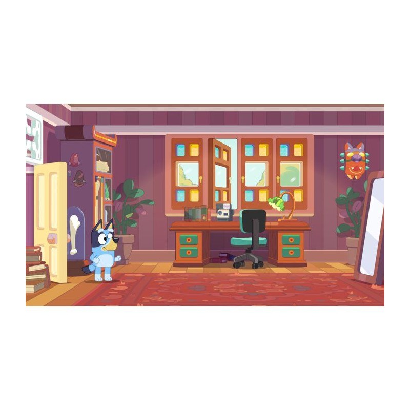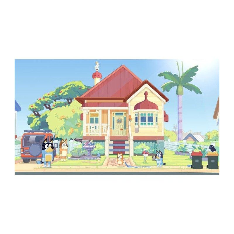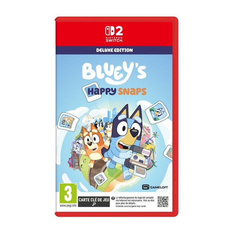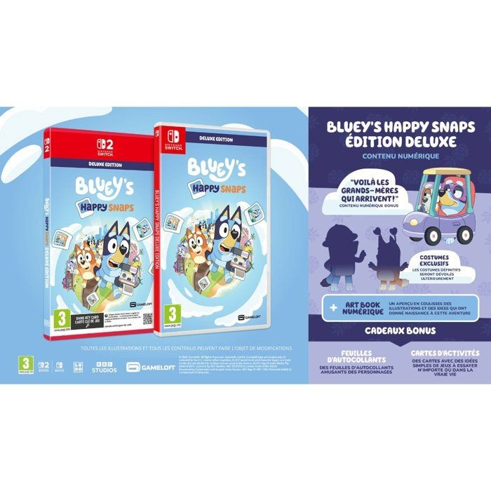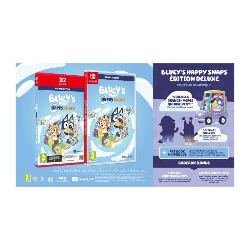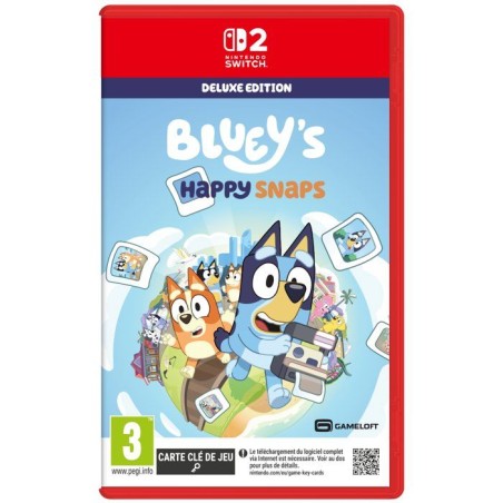 C'est le moment de jouer ! Explorez, amusez-vous et capturez vos moments préférés avec Bluey et Bingo dans ce jeu rythmé par les photographies. Vous retrouverez des lieux de la série, créerez votre propre album et changerez les photos souvenirs dans le jeu en véritables moments ludiques. L'Édition Deluxe apporte encore plus de rires, de déguisements et de fun avec Bluey dans votre aventure. Voila les grands-meres qui arrivent : du contenu exclusif dans le jeu, inspiré des fauteuses de troubles préférées de tous. Objets de déguisement bonus : plus de costumes et de looks rigolos a composer ensemble. Artbook virtuel de Bluey's Happy Snaps : un aperçu en coulisse des illustrations et des idées qui ont inspiré l'aventure.