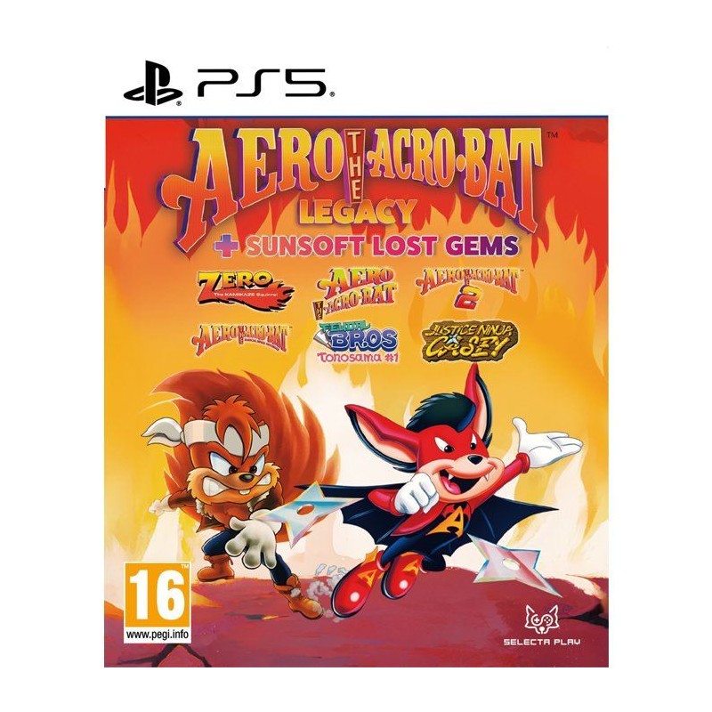 6 pépites rétro SUNSOFT réunies dans une compilation incontournable Aero The Acro-Bat Legacy + Sunsoft Lost Gems rassemble six titres emblématiques, avec un point commun : de l'action arcade a l'ancienne, du pixel-art et des aventures survitaminées. Au programme : la saga Aero The Acro-Bat, un remake modernisé, un jeu de plateforme ninja, un beat'em up et des raretés enfin accessibles. La compilation contient les 6 jeux suivants : - Zero The Kamikaze Squirrel - Aero The Acro-Bat 1 - Aero The Acro-Bat 2 - Rascal Rival Revenge - Feudal Bros (Tonosama #1) - Justice Ninja Casey Zero The Kamikaze Squirrel Alors qu'il travaille pour le machiavélique Edgar Ektor, Zero reçoit une lettre : sa foret est en danger et le pere de sa petite amie a été kidnappé. Il part sans permission... et Edgar n'a pas l'intention de le laisser filer. - 15 niveaux d'action ninja intense (dont certains avec des attractions). - Maîtrisez les compétences de combat de Zero et affrontez de redoutables boss. - Choisissez entre la version anglaise et la version japonaise. Aero The Acro-Bat 1 Edgar Ektor veut détruire le monde du spectacle. Il envahit un cirque, kidnappe le personnel... et c'est a Aero, la vedette acrobate, de sauver ses amis et sa petite amie Ariel. - 4 zones de 5 niveaux chacune (dont certains avec des attractions). - Utilisez les talents acrobatiques d'Aero pour accomplir les objectifs et progresser. - Choisissez entre la version anglaise et la version japonaise. Aero The Acro-Bat 2 Apres avoir contrecarré Edgar Ektor, Aero explore un musée de l'horreur... et se retrouve aspiré dans un lieu mystérieux. Edgar a survécu, et le « plan B » est en marche. - 8 zones de 3 niveaux chacune (dont certains avec des attractions). - Surmontez des obstacles mortels et affrontez d'étranges ennemis. - Choisissez entre la version anglaise et la version japonaise. Rascal Rival Revenge Un remake du classique, avec des améliorations visuelles et de gameplay, et une nouvel