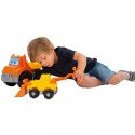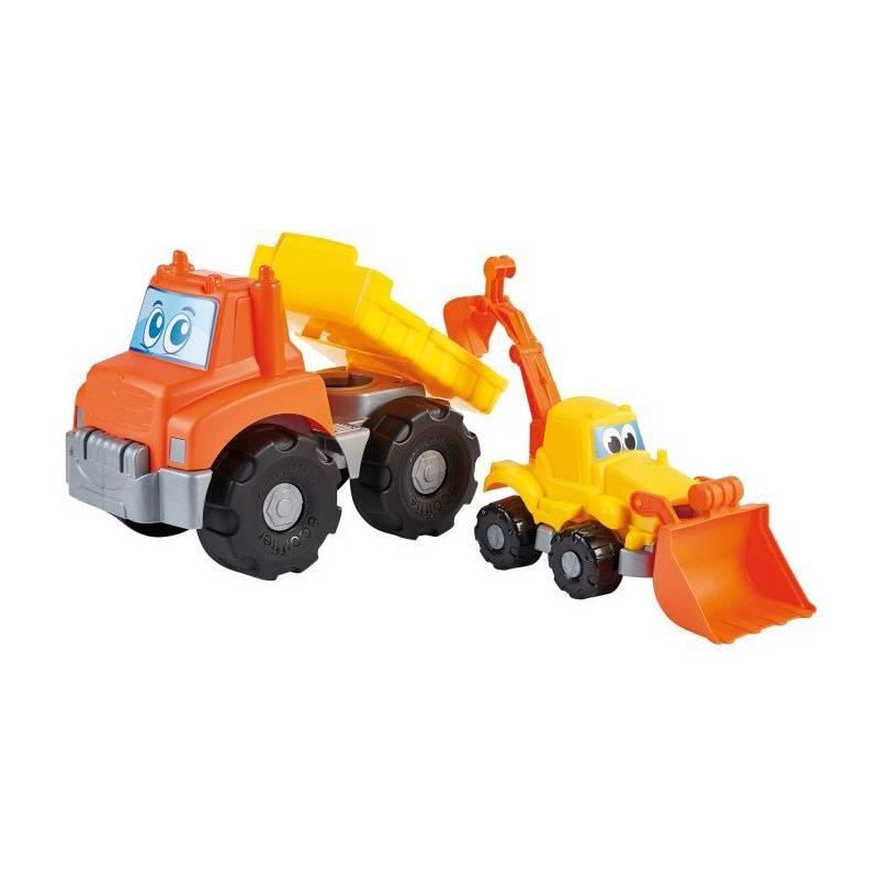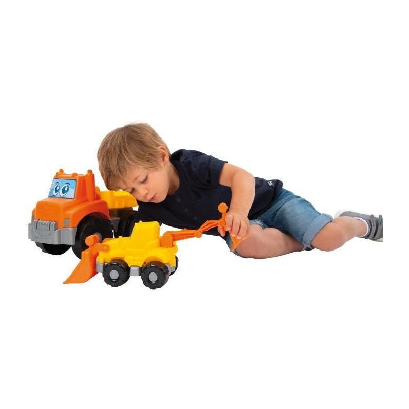 Un camion de travaux publics transportant un tractopelle avec une pelle avant et un godet avec bras articulé a l'arriere. Origine France Garantie. Conseillé des 18 mois.
