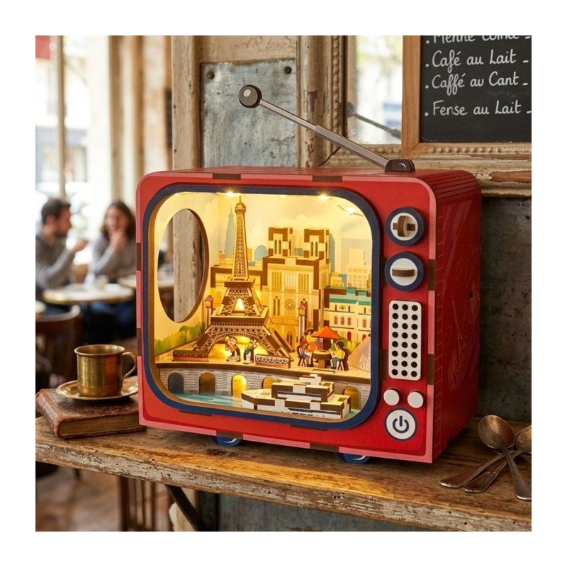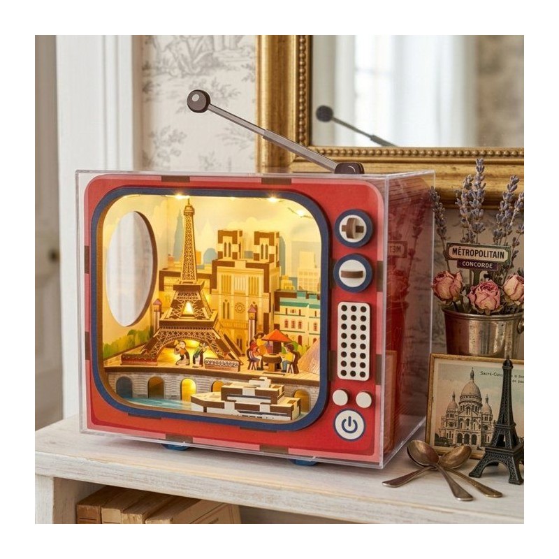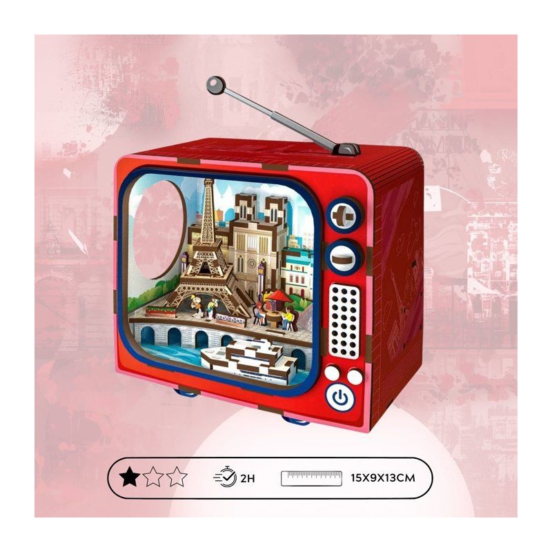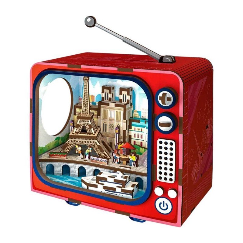 Cette television ancienne renferme un decor poetique de Paris, avec la Tour Eiffel mise en valeur. Une petite fenetre vers la capitale.