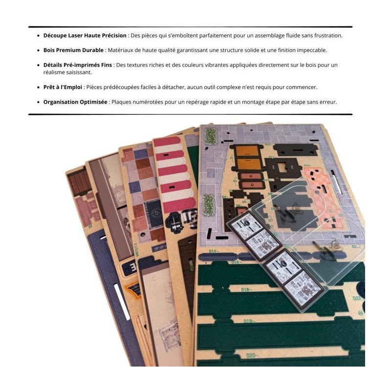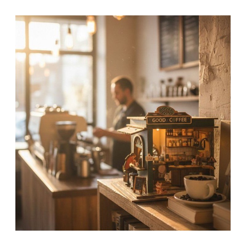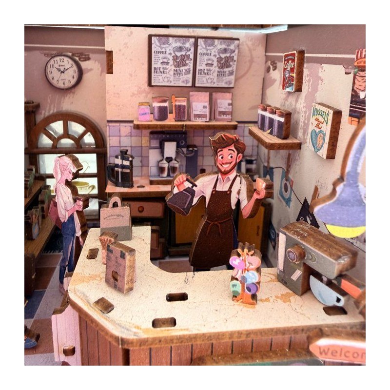 Ce coffee shop miniature capture une ambiance cosy avec son bar en bois, ses chaises hautes et sa petite table accueillante. Parfait pour ajouter une touche chaleureuse a une bibliotheque.