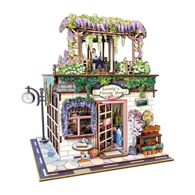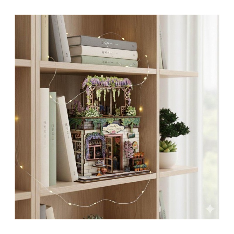 Ce booknook enchanteur devoile une jolie boutique de fleurs surmontee d'un rooftop fleuri avec banc et detente. La terrasse et les murs sont recouverts de glycines, creant un cocon vegetal plein de poesie.